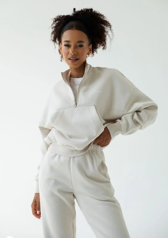 Bluza w pięknym, kokosowym odcieniu dla miłośniczek casualowych bomberek z wygodną stójką. Fason z praktyczną kangurkową kieszenią i zapięciem.