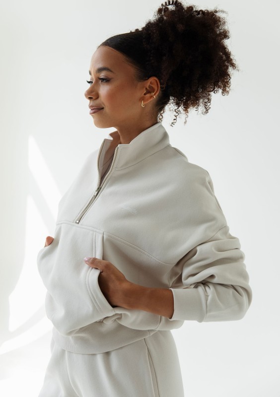 Bluza w pięknym, kokosowym odcieniu dla miłośniczek casualowych bomberek z wygodną stójką. Fason z praktyczną kangurkową kieszenią i zapięciem.