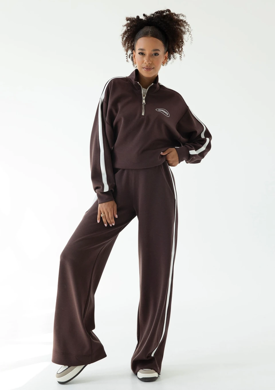 Brązowa bluza Sway wykonana z gładkiej i sprężystej dzianiny z dodatkiem modalu. Wygodny fason ma rozpinaną stójkę i modne lampasy.