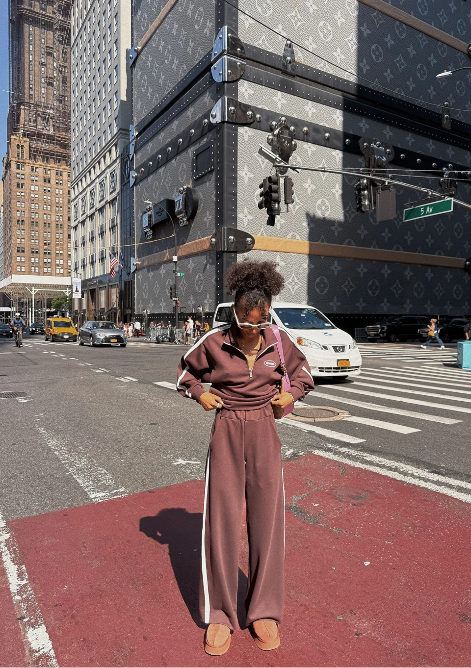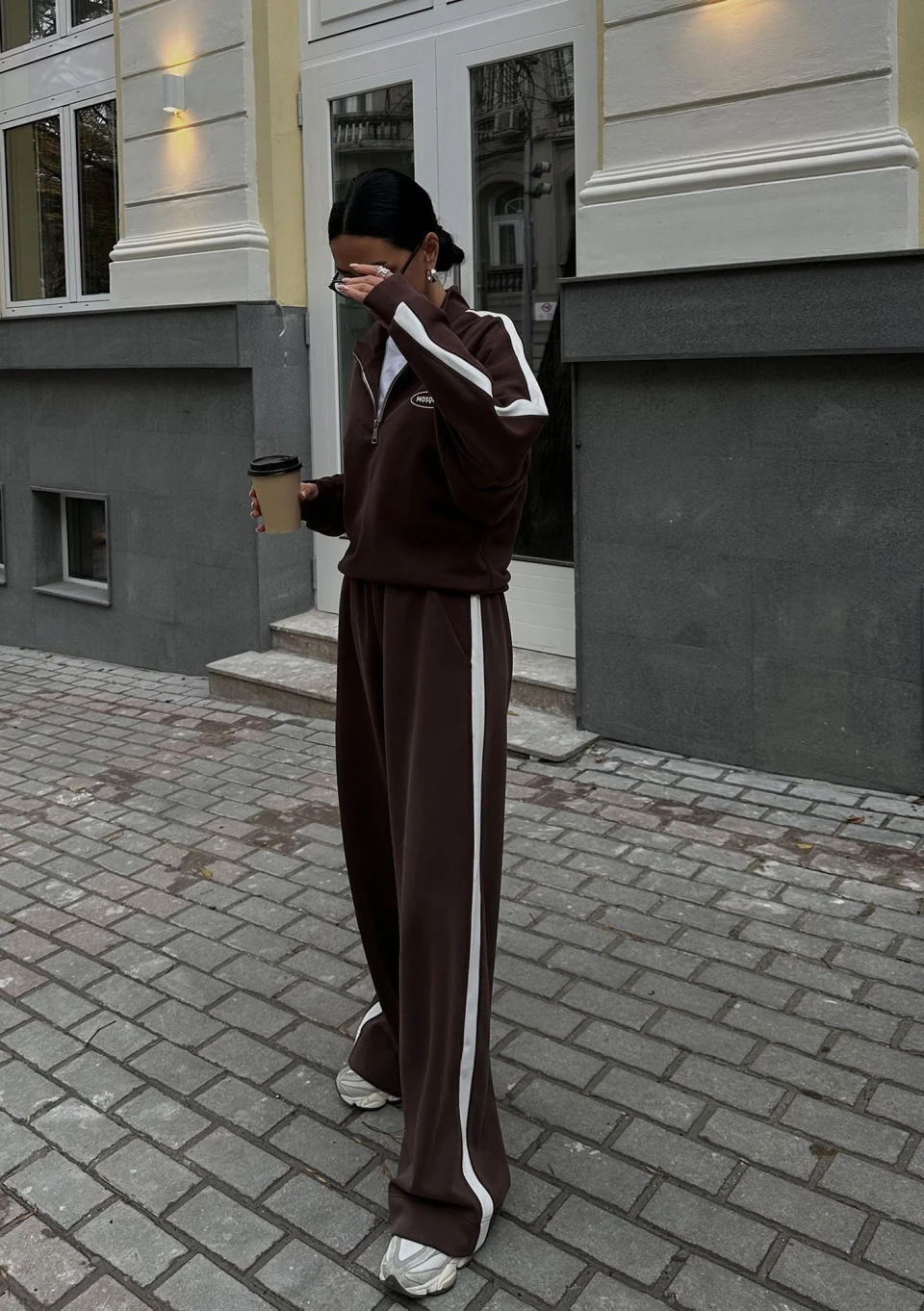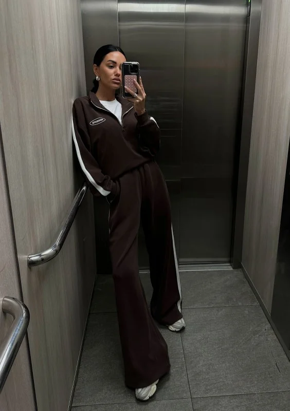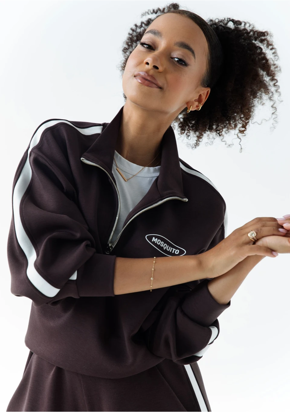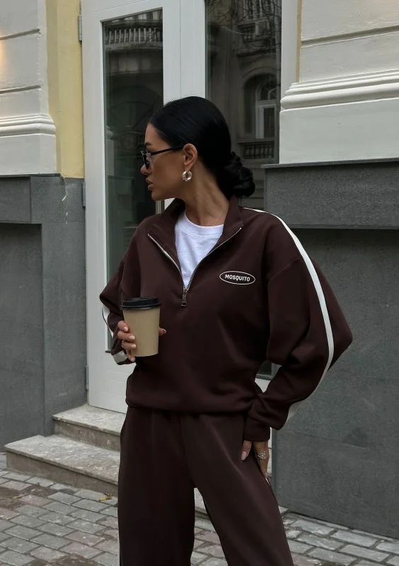 Brązowa bluza z rozpinanym dekoltem ma sportowy styl przypominający klasyczne dresy z lat 90 i początków 2000. To najmodniejsza inspiracja wśród nowoczesnych fasonów! Lampasy i charakterystyczne logo zapewnią Ci wyrazisty look. Nasza stylowa bluza damska nadaje się do noszenia na co dzień, na spacer, na siłownię, a także jako element modnej stylizacji w stylu athleisure, czyli połączenia ubrań sportowych z miejskim, codziennym ubiorem. Będą pasowały do niej dedykowane spodnie Sway.