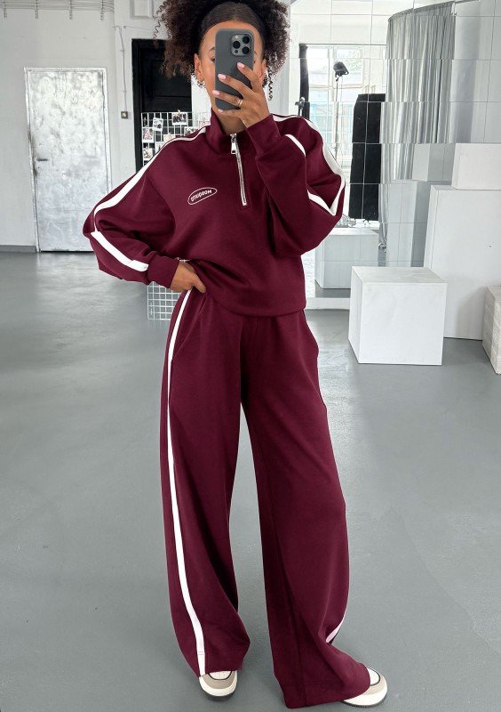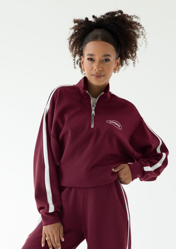 Bordowa bluza Sway wykonana z gładkiej i sprężystej dzianiny z dodatkiem modalu. Wygodny fason ma rozpinaną stójkę i modne, ozdobne lampasy.