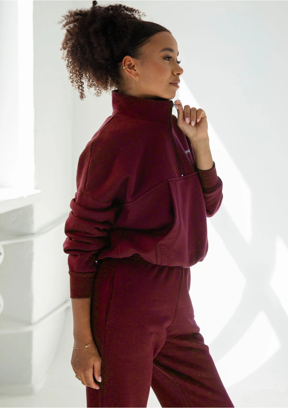 Bordowa bluza damska dla miłośniczek uniwersalnych fasonów z wygodną stójką. Model z praktyczną kangurkową kieszenią i zapięciem.