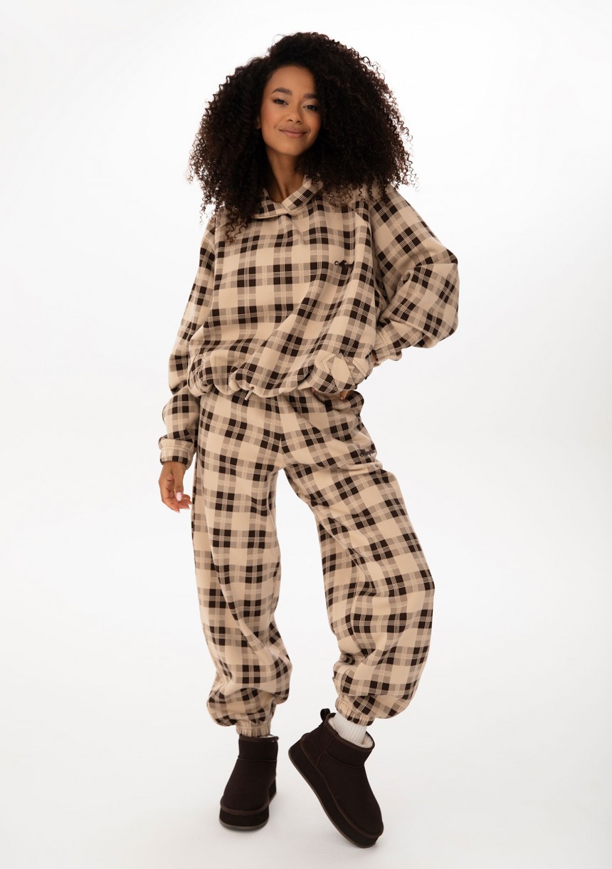 Wyjątkowa, luźna bluza z kapturem w kratę, łącząca beż z brązem. Zapewnia modny oversize look i maksymalny komfort na co dzień.