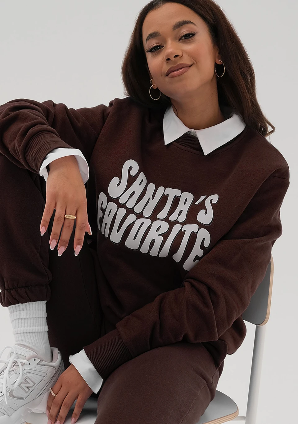 Ciepła, brązowa bluza z wyraźnym, świątecznym napisem "Santa's Favourite" (Ulubienica Mikołaja). To idealny wybór, aby podkreślić swój świąteczny nastrój w zabawny sposób!