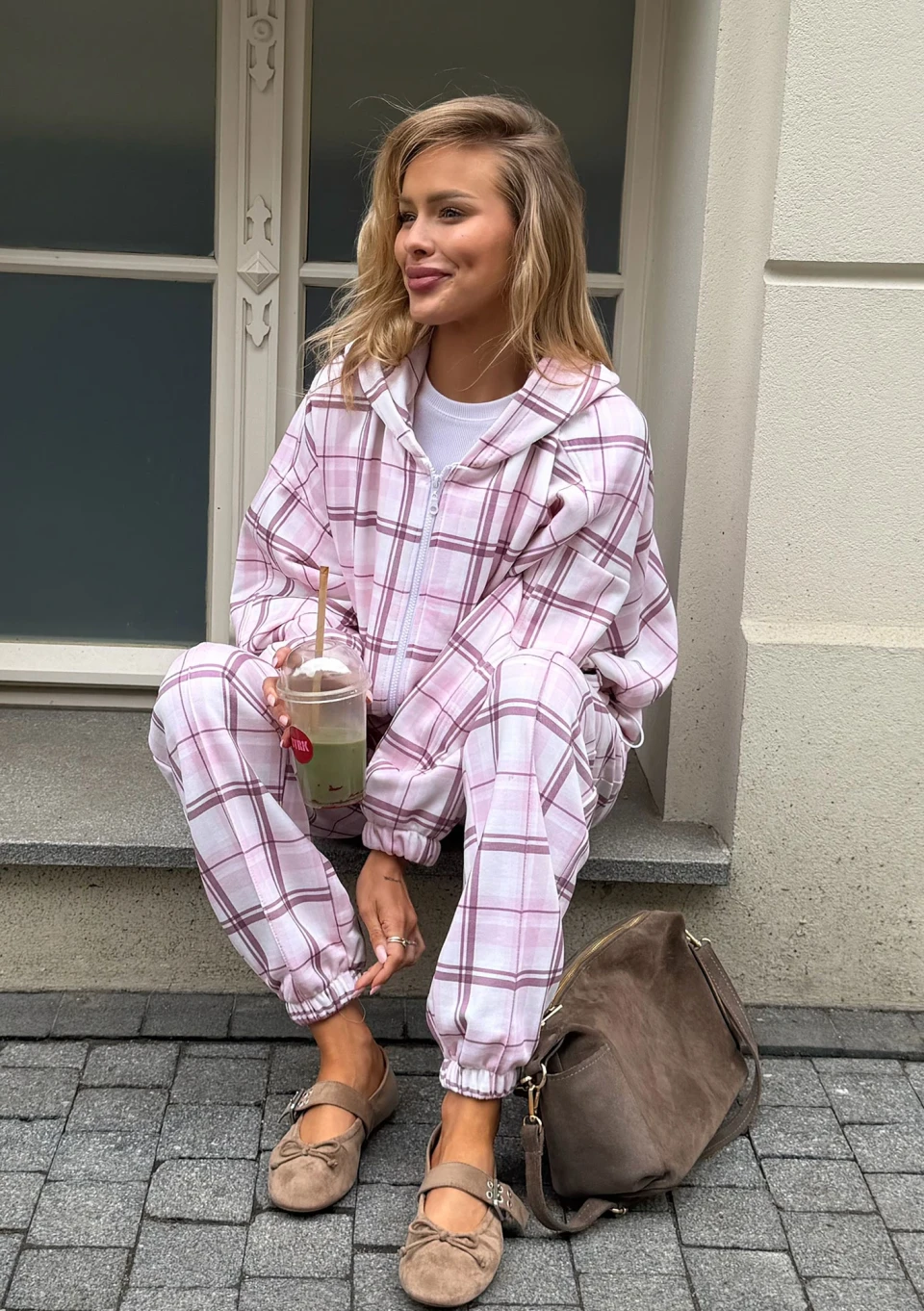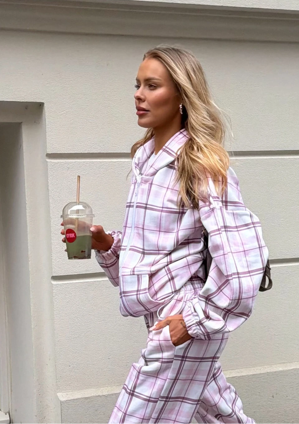Modna bluza w kratę w stylu loungewear, z kapturem i zamkiem. Ma fason oversize i została wykonana z miękkiej dzianiny pętelki.