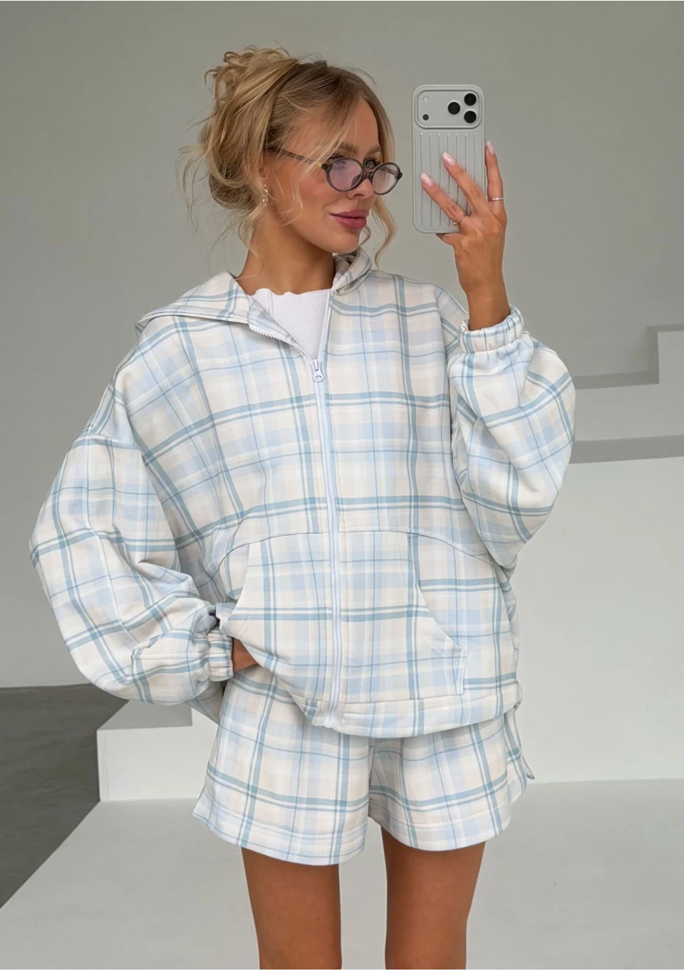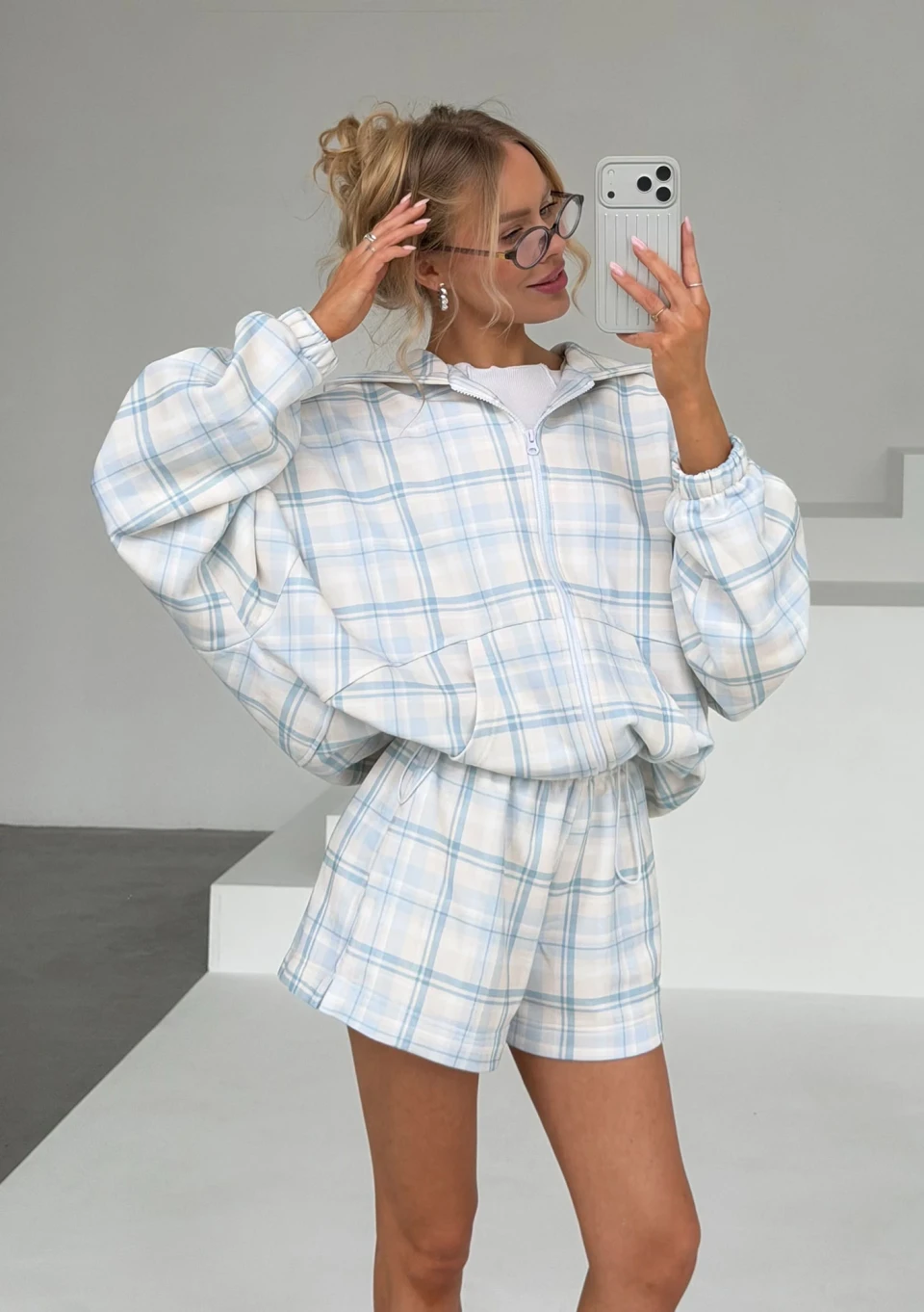 Stylowa bluza na zamek w błękitną kratę to kwintesencja nurtu loungewear, które na dobre zapanowały w modzie ulicznej. To ten rodzaj ubrania, który zaciera granicę między domowym komfortem a dopracowanym lookiem. Już nie musisz wybierać między „wyglądać dobrze” a „czuć się swobodnie” – ten model łączy obie te rzeczy! Świetna na każdy, wiosenny spacer i weekendowe wycieczki.