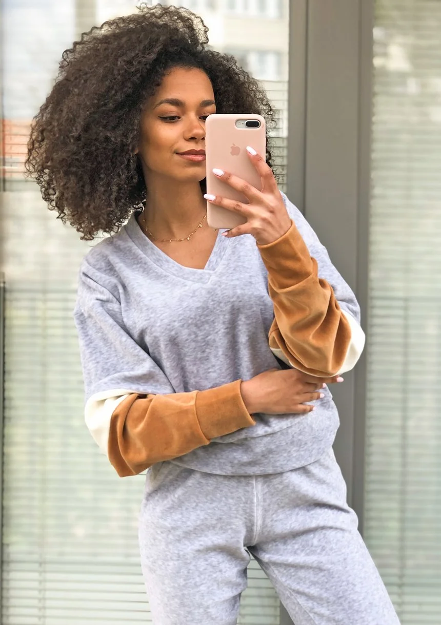 Bluza damska, zachwycająca połączeniem stonowanych, klasycznych barw stanowi ponadczasowy element stylizacji, odpowiedni w połączeniu ze spodniami dresowymi i obuwiem sportowym. Szara bluza damska ze wstawkami poziomymi w odcieniu kremowym oraz klasycznym, brązowym prezentuje się wyjątkowo. Została wykonana z miękkiej w dotyku, lekkiej tkaniny bawełnianej z dodatkiem elastanu, a jej włókna posiadają pętelkowe wykończenie (jak frotte). Welurowa bluza damska z dekoltem V, z szerokimi ściągaczami na końcach rękawów oraz subtelnym u dołu, zaskakuje swoim krótkim, efektownym fasonem. Luźna bluza damska z łączącymi się barwami pięknie prezentuje się na codziennym spacerze, podczas zakupów, na spotkaniu z przyjaciółką. Dzięki szerokim rękawom nie krępuje ruchu. Stylowa, sportowa bluza wyróżnia się unikalnym połączeniem klasycznych barw, które są niezmiennie modne i doskonale prezentują się u kobiet o każdym typie urody. Wysokiej jakości bluza welurowa w trzech odcieniach to absolutny must have.
