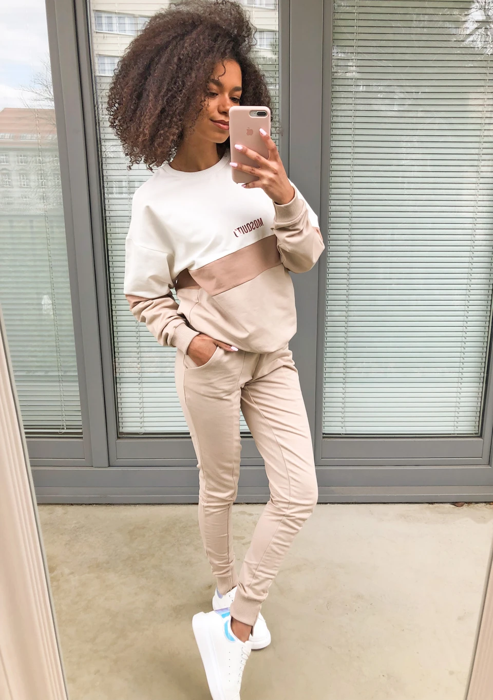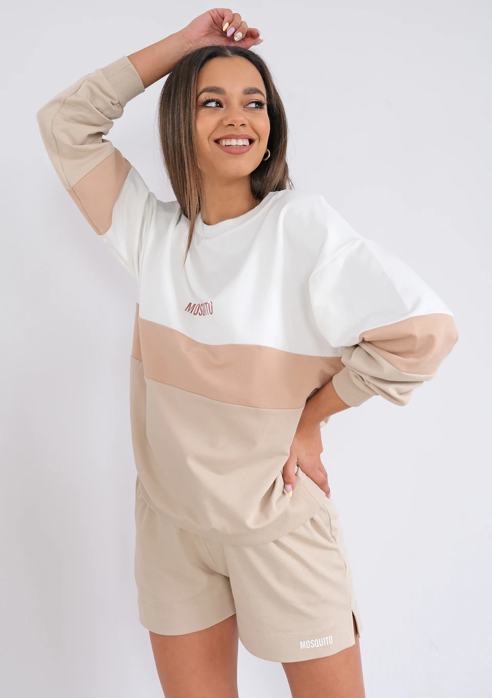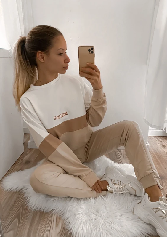 Bluza dresowa w naturalnej kolorystyce beżu i bieli. Szyta z przewiewnej i lekkiej dzianiny bawełnianej, idealna również na cieplejsze pory roku. Ozdobiona nadrukiem.