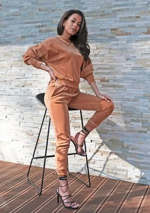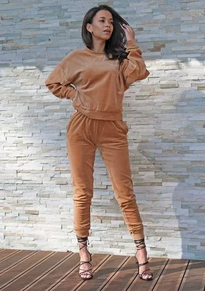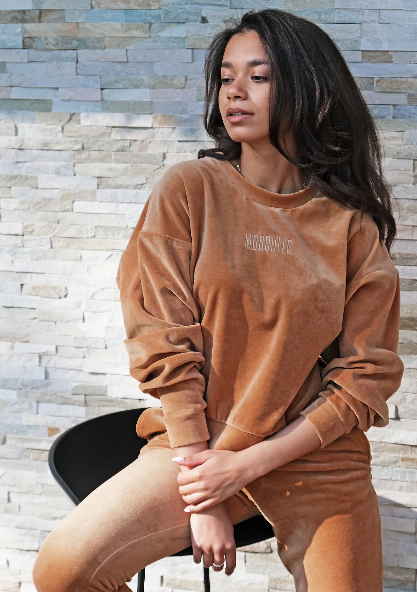Prezentowana damska bluza dresowa uszyta została w Polsce z wysokogatunkowej, lekko elastycznej bawełny o welurowym wykończeniu. Ma zatem miękką, bardzo przyjemną w dotyku fakturę z delikatnym połyskiem, który nadaje uroku. Bluza posiada klasyczny, swobodny fason, który doskonale tuszuje wszelkie mankamenty figury. Została wyposażona również w dolny ściągacz w pasie oraz dodatkowe ściągacze na końcach rękawów, dzięki czemu dobrze układa się na ciele. Bluzę wykończono kobiecym, okrągłym dekoltem, który zapewnia odpowiedni komfort. Jej ozdobą jest haftowane logo z nazwą firmy, wykonane przy pomocy pasującej kolorystycznie nici. Dzięki miodowej barwie tkaniny, bluza pięknie prezentuje się w zestawieniu z ciepłą karnacją skóry.