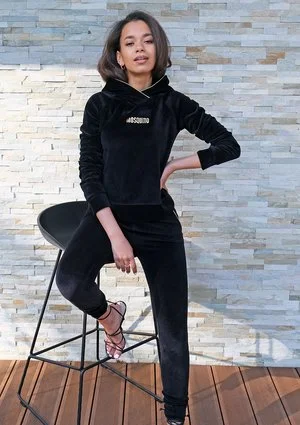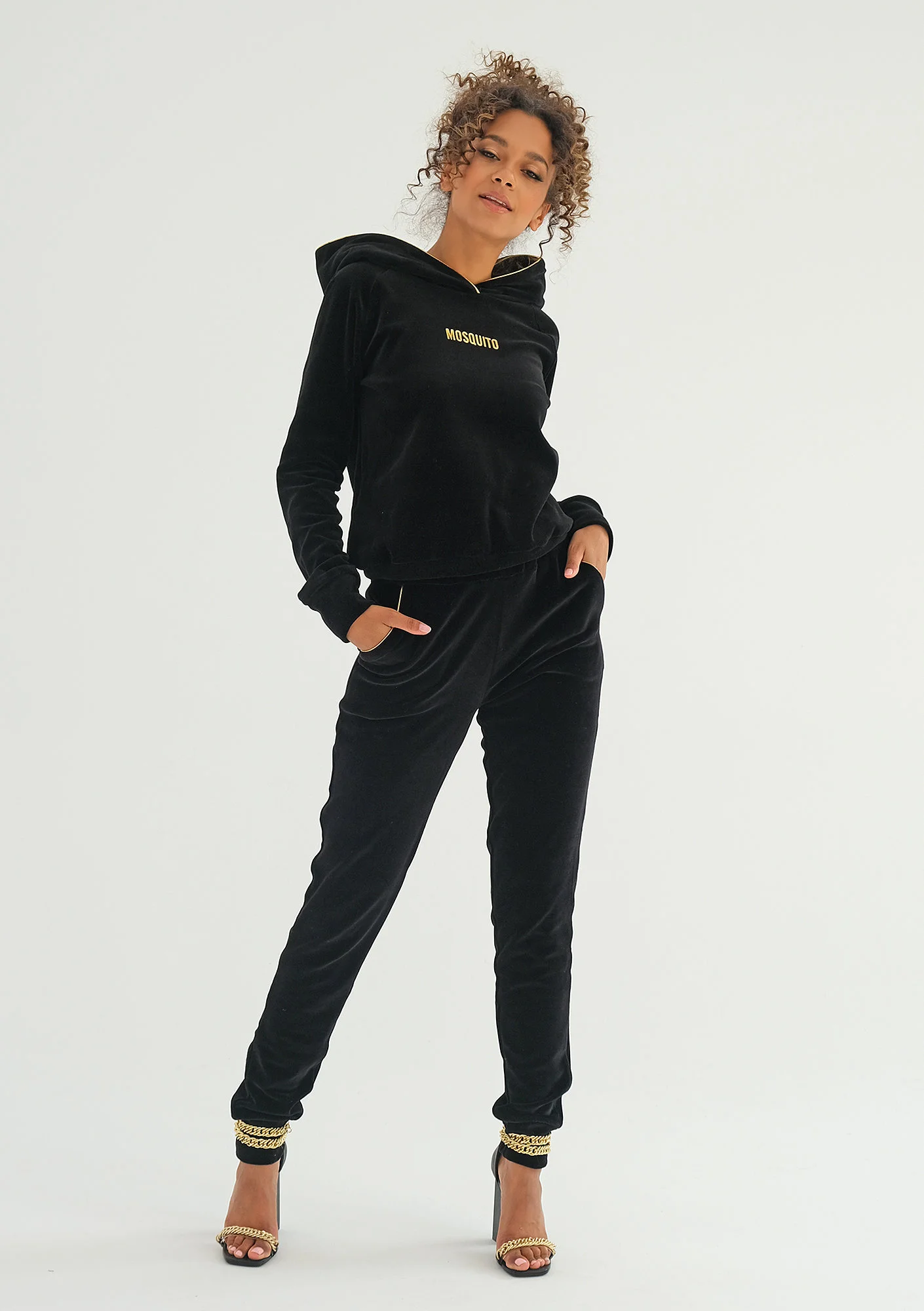 Bluza dresowa damska o nieco bardziej dopasowanym kroju to dobre rozwiązanie dla pań, które lubią podkreślać atuty swojej sylwetki. Produkt został uszyty w Polsce z wysokiej jakości delikatnie rozciągliwej bawełny, która nie krępuje ruchów i nie podrażnia skóry. Czarny aksamit jest przyjemny w dotyku i świetnie się prezentuje. Daje również wrażenie ekskluzywności i luksusu - szczególnie w połączeniu ze złotymi akcentami. Bluza posiada praktyczne ściągacze na końcach rękawów oraz w pasie. Dzięki nim dobrze układa się na ciele. Wyposażono ją również w efektowny, obszerny kaptur, który dodaje stylizacji charakteru. Bluza będzie idealną bazą do stroju codziennego, odpowiedniego na wyjście z przyjaciółmi, na zakupy czy na spacer.