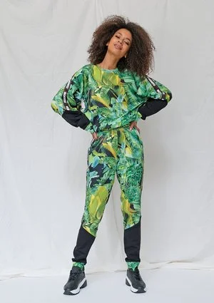 Energetyczne wzory i komfortowy krój - właśnie taka jest dresowa bluza damska Black Bananas. Jej zielony odcień widoczny jest już z daleka, a nagromadzone w nadruku szczegóły przyciągają wzrok innych. Odzież świetnie sprawdzi się w szafach kobiet stawiających na oryginalność. Krój zaprojektowany został bowiem tak, by stanowił niepowtarzalną kompozycję. Egzotyczny nadruk uzupełniany jest wstawkami z ciemnego materiału oraz lampasami z nazwą marki, a w Mosquito kupić można spodnie uszyte w tym samym stylu! Bluza ma długie, zwężane przy nadgarstkach rękawy. Luźno układają się one wzdłuż ciała i nie podrażniają wrażliwej skóry. Od ramion do łokci poprowadzono ciemny lampas z napisem "MOSQUITO". Na przedramionach zastosowano z kolei wstawkę z ciemnej tkaniny, która doskonale uzupełnia projekt. Energetyczny design to efekt pracy Alicji Komar. Bluzę zamówić można w rozmiarach XS - L.