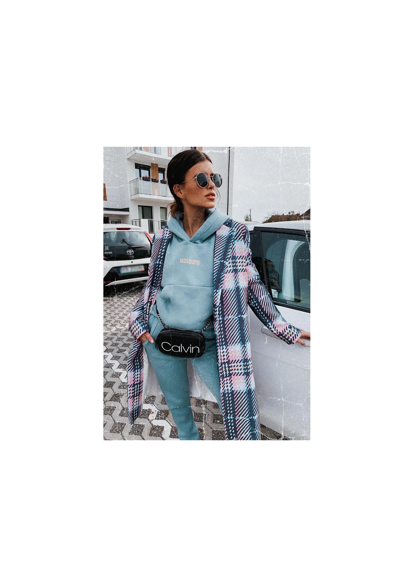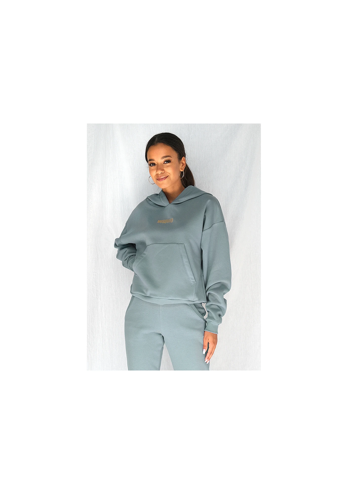 Krój przypomina klasyczne bluzy hoodie. Zabudowany dekolt wykończony jest głębokim kapturem, świetnie utrzymującym się na głowie. Długie, obniżane rękawy kończy ściągacz przy nadgarstku. Pozwala to podwijać rękawy według uznania. Na brzuchu damska bluza ma z kolei dużą kieszeń typu "kangur". Kolor Blue Stone wykończony jest złotą wstawką na biuście - napisem MOSQUITO. Odzież jest bardzo praktyczna. Z powodzeniem prać ją można w pralce, a trudne do usunięcia plamy z łatwością znikają z powierzchni tkaniny. Za projekt bluzy odpowiada Alicja Komar.