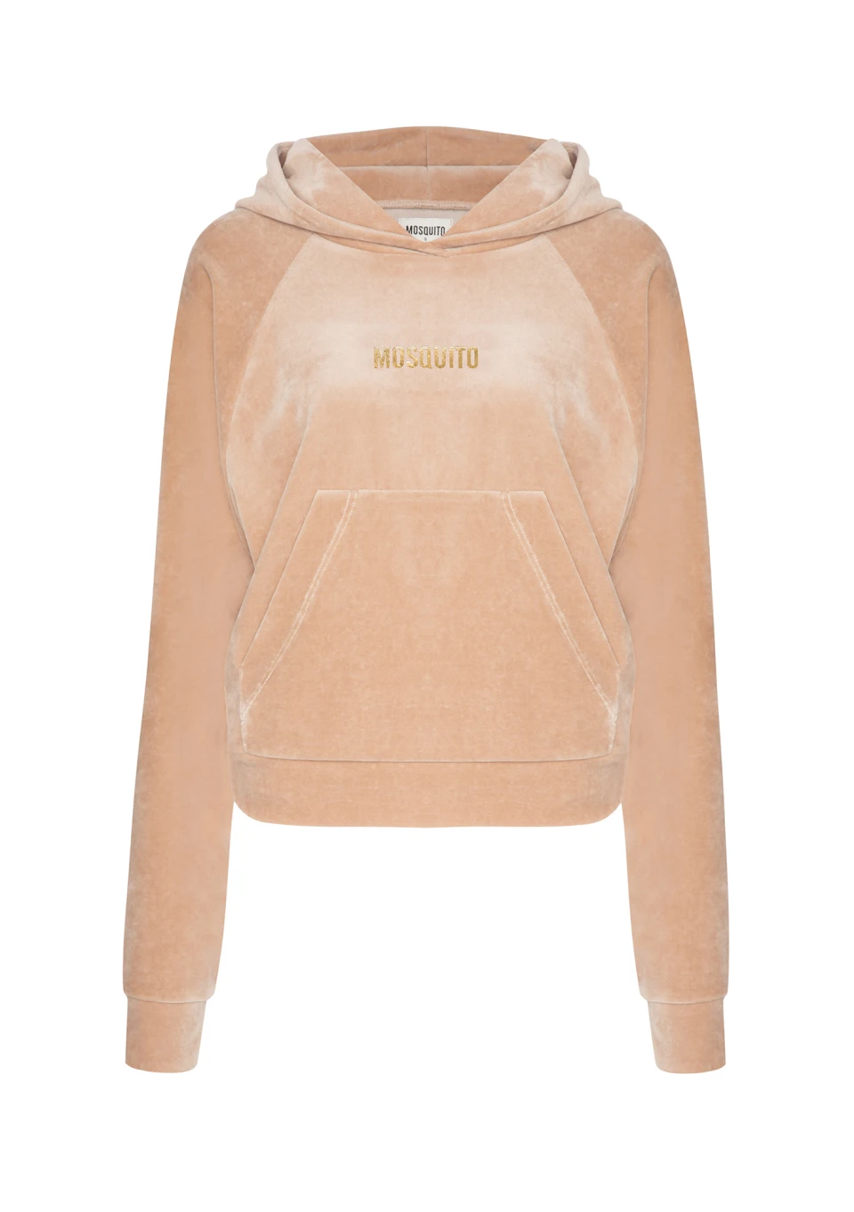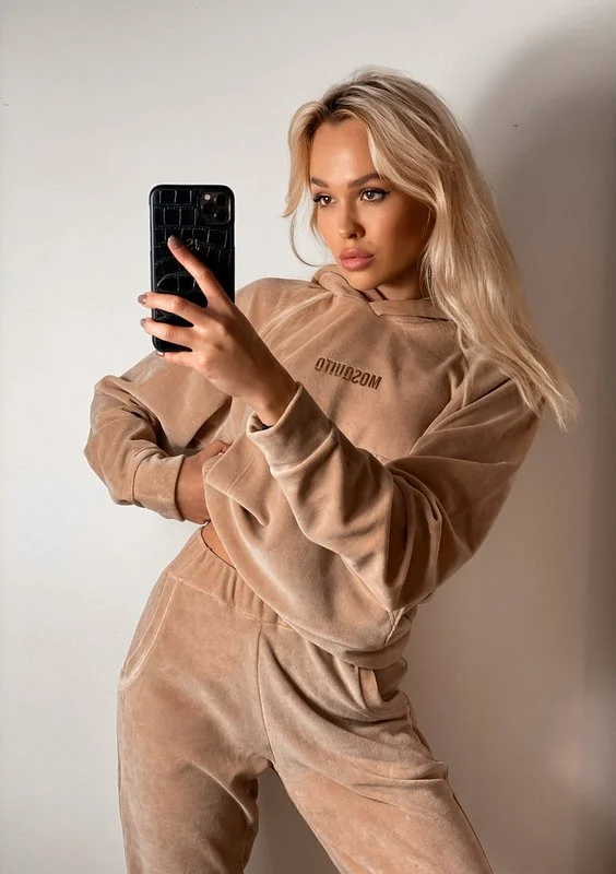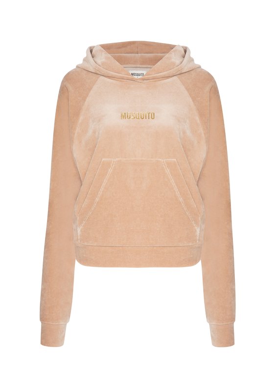 Stylowa bluza w kolorze jasnego beżu, ozdobiona złotym, mieniącym się logiem. Wykonana z weluru o lśniącej fakturze. Bestseller, posiada luźny, ale i podkreślający sylwetkę, krótki fason.