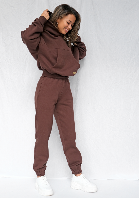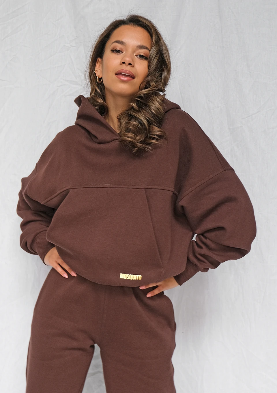 Bluza damska z kapturem, wykonana z przyjemnie miękkiej dzianiny. Model o bardzo luźnym, niedługim fasonie z wygodnymi ściągaczami i praktyczną, kangurkową kieszenią. Zachwyci Cię głębią czekoladowego koloru!