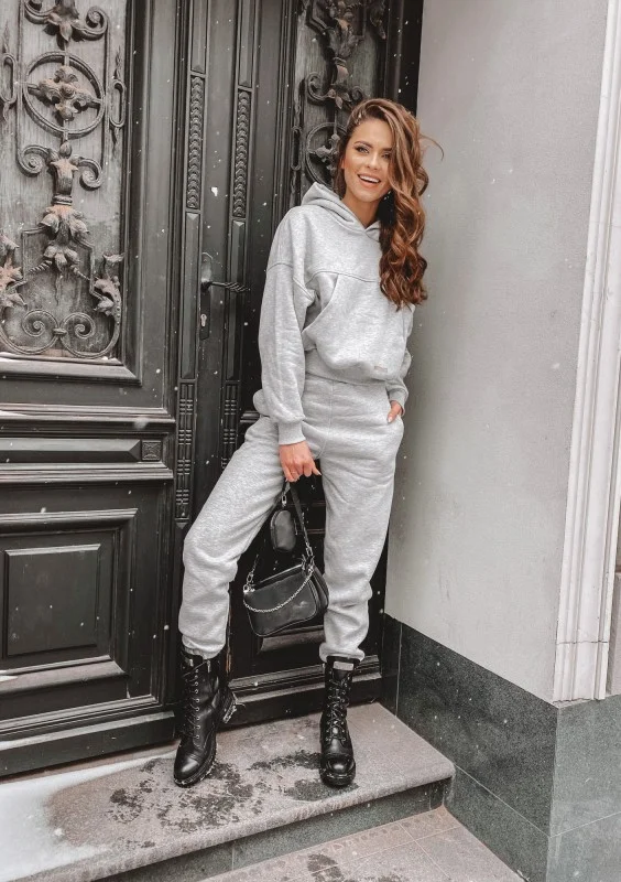 Uniwersalna, szara bluza damska z kangurkową kieszenią i wygodnym kapturem. Wykonana z miękkiej dzianiny o melanżowym wzorze, posiada krótki, bardzo luźny fason.