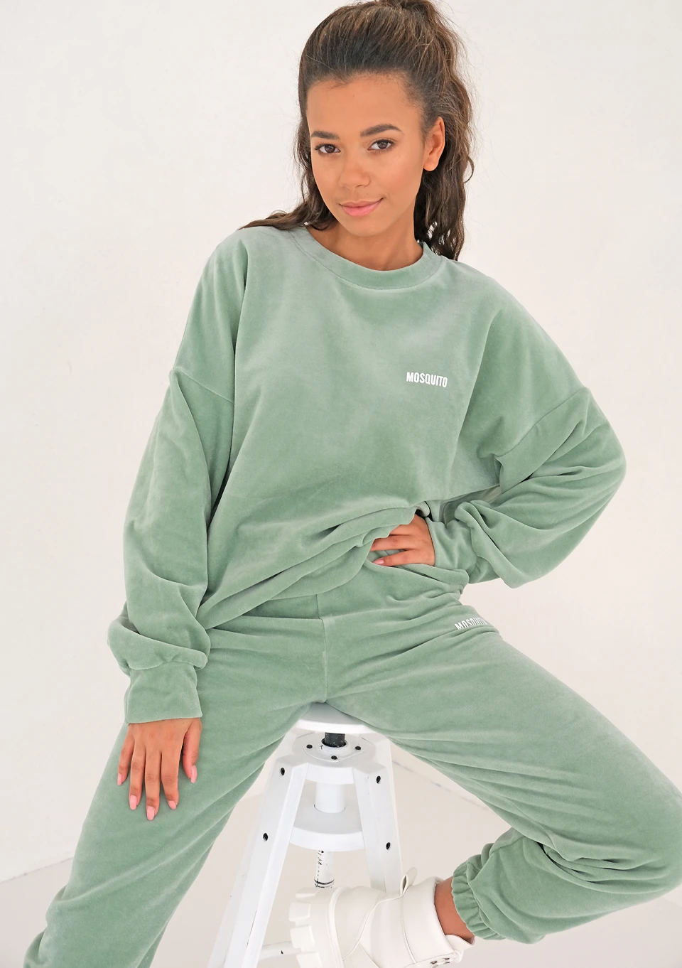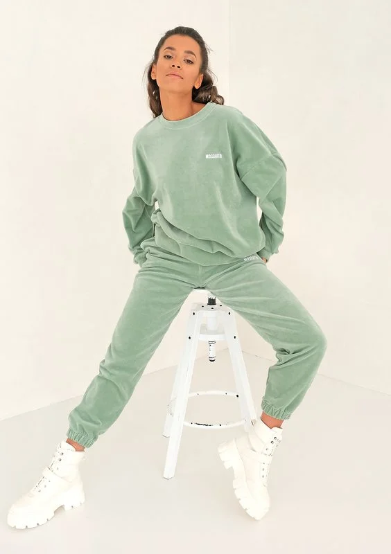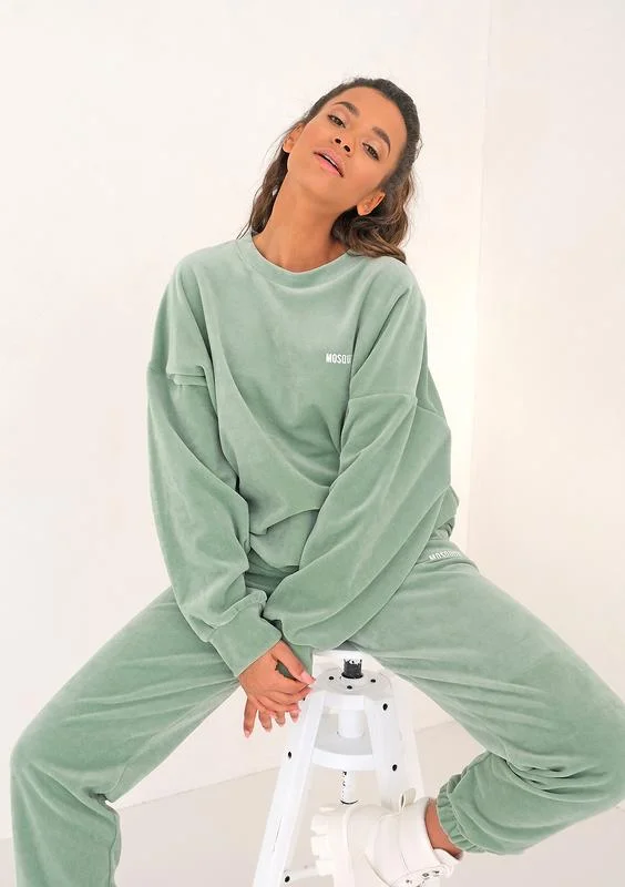 Pastelowa bluza oversize, w zachwycającej, welurowej odsłonie. Jej miętowy odcień, stylowo zaakcentowany białym logiem, idealnie wpisze się w charakter każdej pory roku.
