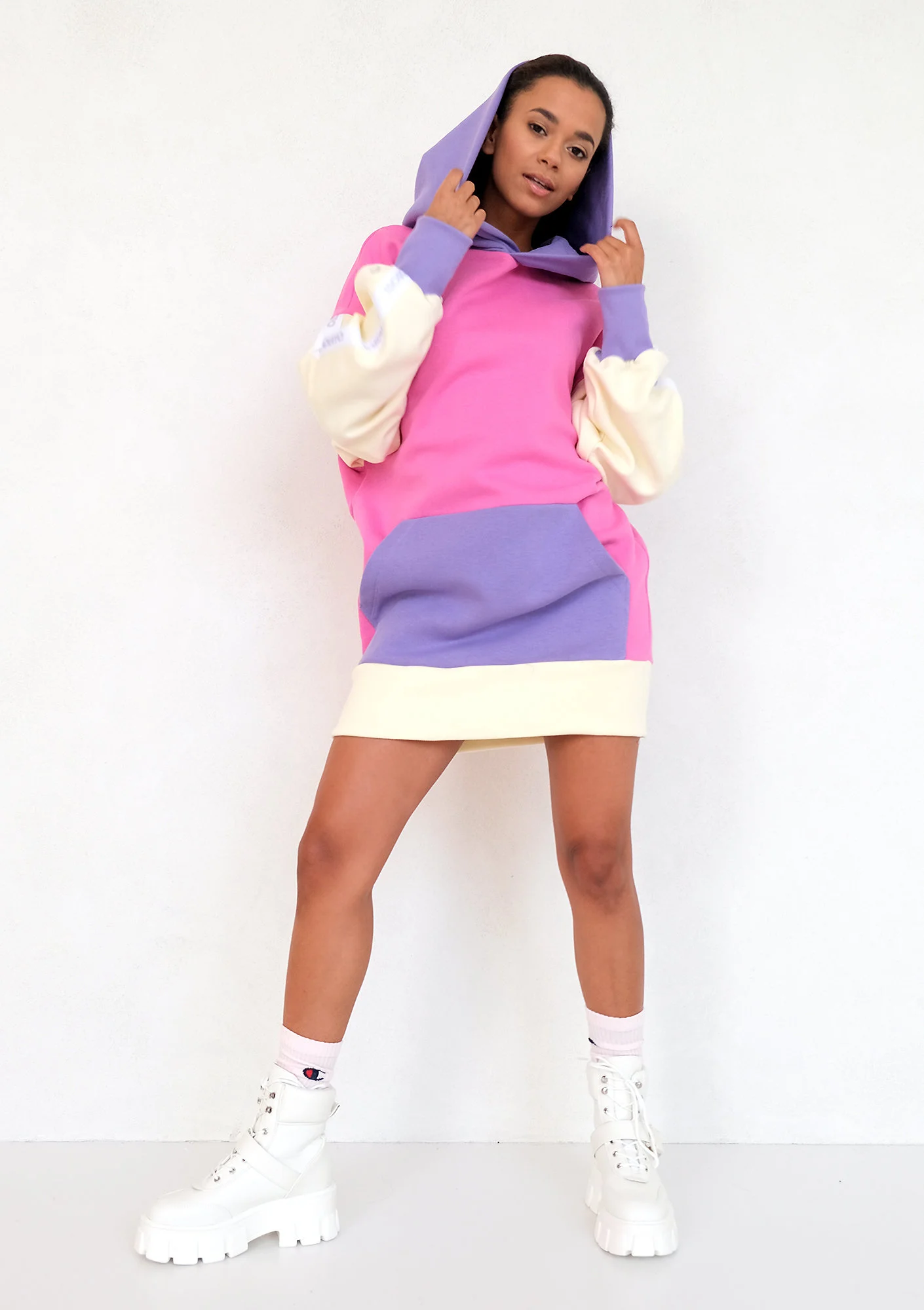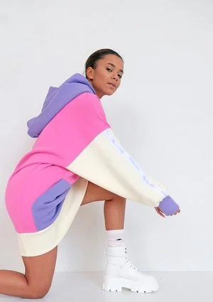 Postaw na wesoły retro look, nawiązujący do szalonych lat 90-tych, kiedy chodziło się w multi kolorowych dresach. Odświeżamy sprawdzone trendy i podajemy w nowej odsłonie. Prezentowana tunika w głównej tonacji fuksji to wprowadzający w dobry nastrój, trójkolorowy model, idealny na wiosenne spacery i miejskie przechadzki. Ta śliczna tunika zachwyci w szkole oraz na zajęciach na uczelni. Jej figlarny, zabawny charakter rozluźni atmosferę, a Ty poczujesz się wygodnie przez cały dzień. Lekko oversize’ovy fason przypomina sportową bluzę oraz stanowi dla niej ciekawą alternatywę. Z przodu znajduje się duża kieszeń w kolorze jasnego fioletu, w której możesz schować podręczne gadżety i telefon.