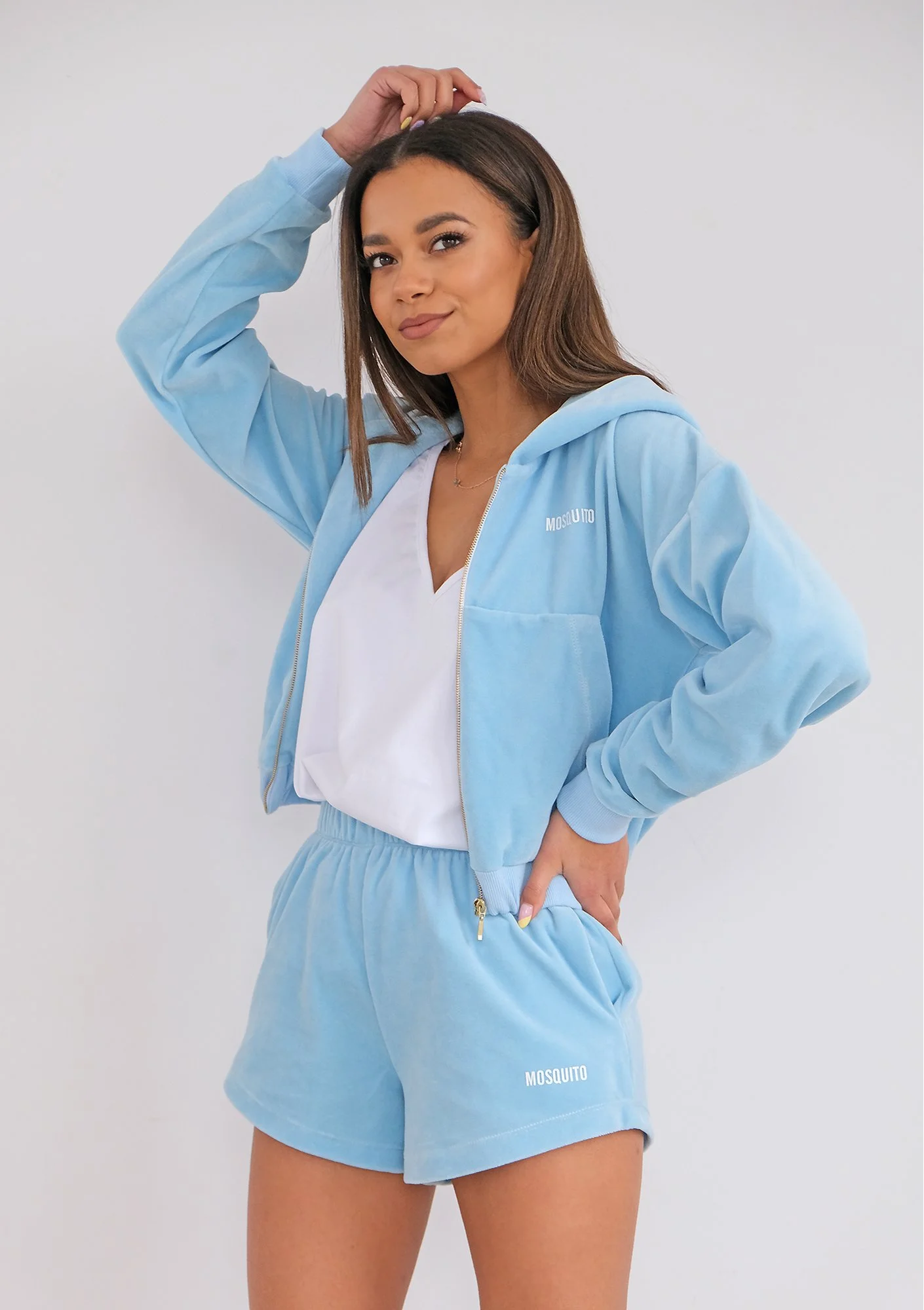 Wasze ulubione, dresowe bluzy welurowe Mosquito doczekały się zupełnie nowej odsłony. Tym razem naszą propozycją jest model rozpinanej bluzy z kapturem o krótkim fasonie – taki krój stanowi strzał w dziesiątkę na lato. Welurowa, błękitna bluza posiada solidny zamek błyskawiczny w złotym kolorze. Z przodu ubrania umieściliśmy białe logo marki, w dość subtelnym, drobnym rozmiarze. Bluza posiada kaptur oraz wysoko sięgające, dwie kieszonki boczne. Długie rękawy są zakończone estetycznymi zwężeniami. Szyjemy ją w popularnych rozmiarach: XS, S, M, L.