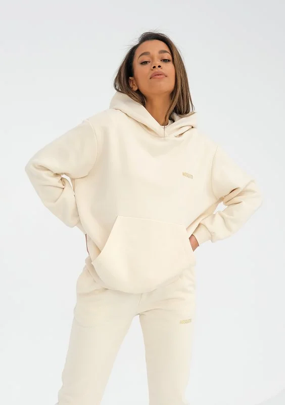 Cudnie kremowa bluza dresowa o waniliowym odcieniu. Szyta z bawełnianej dzianiny. Ma luźny, sportowy fason z kieszenią i kapturem. Ozdobiona mieniącym się, złotym nadrukiem.