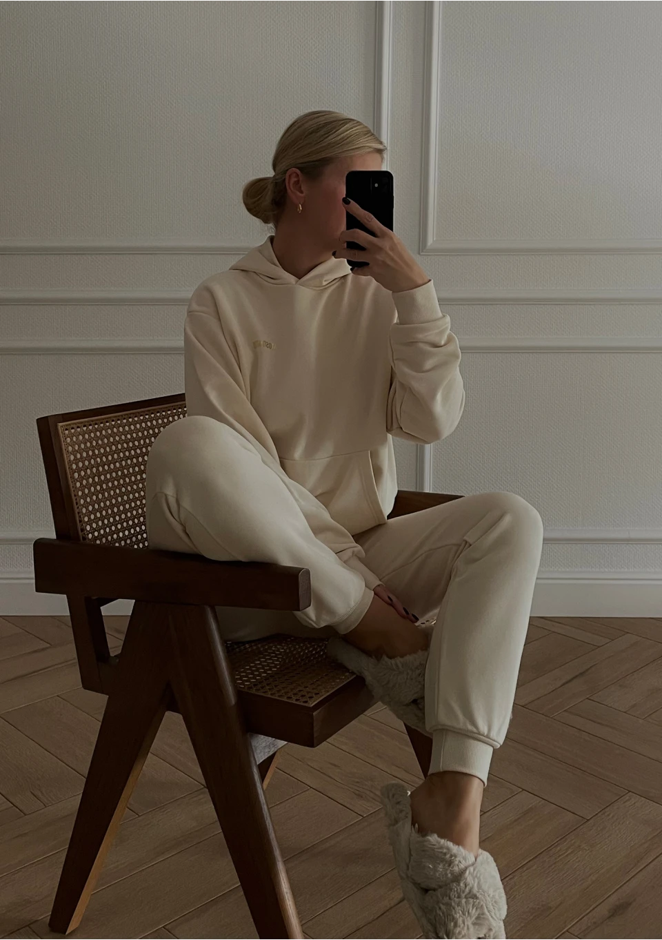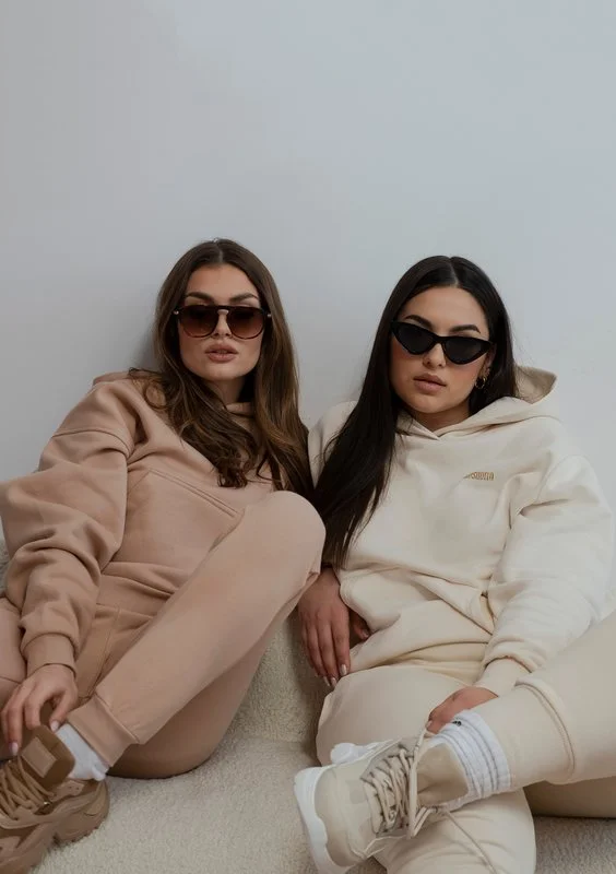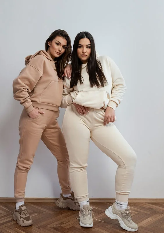 Fason luźny, kangurkowy, z kapturem i wygodnymi ściągaczami.