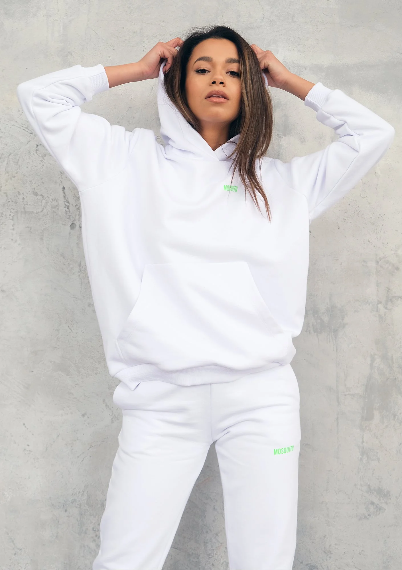 Biała bluza damska oprócz oryginalnego koloru logotypu zachwyci Cię także wygodnym fasonem – jest ona lekko luźna, a długością sięga poniżej pasa. Szczegółowe wymiary poszczególnych rozmiarów z zakresu XS – L znajdziesz w tabeli powyżej. Ta piękna bluza z kapturem w świeżej, estetycznej bieli jest szyta z przewiewnej, certyfikowanej bawełny z drobnym dodatkiem poliestru. Bluza jest odrobinę miękka, ale nie ocieplona od spodu – spodnią fakturę materiału przedstawia ostatnie ze zdjęć. Bluza jest ubraniem przyjaznym środowisku: bawełna jest surowcem naturalnym, a poliester w całości pochodzi z recyklingu. Do kompletu znajdziesz w naszej nowej kolekcji białe spodnie dresowe, choć możesz bawić się modą i miksować kolory – limonkowe logo mają również szare i czarne spodnie, które także będą świetnie pasować do tej białej kangurki!