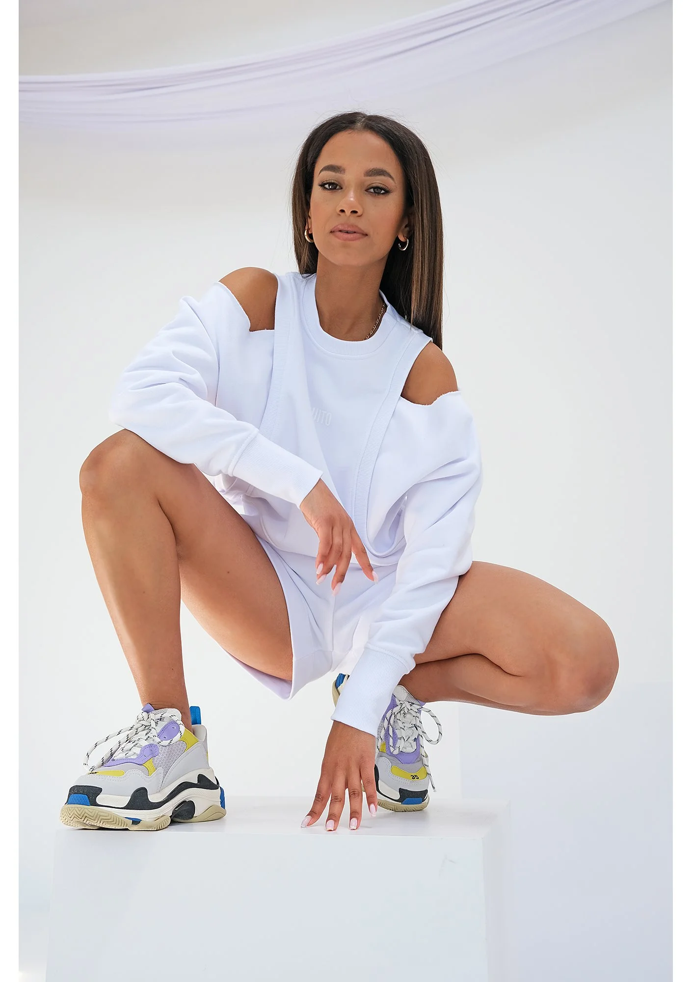 Biała bluza z odkrytymi ramionami jest kreatywną propozycją okrycia na wiosnę i lato. Stwórz całkiem nowy look i postaw na jej niesztampowy krój! Bluza cudnie wyeksponuje Twoje muśnięte słońcem ramiona, a przy tym zaciekawi niespotykanym fasonem. Biel to uniwersalny i zawsze dobry wybór – jasny kolor nie tylko rozświetla, ale i pasuje do każdego, innego odcienia. Na wysokości biustu znajduje się delikatne, białe logo Mosquito. Bluza jest krótka, dlatego dobrze zaprezentuje się ze spodniami i szortami, również z wyższym stanem. Możesz kupić ją w naszym sklepie w czterech popularnych rozmiarach: XS, S, M i L.