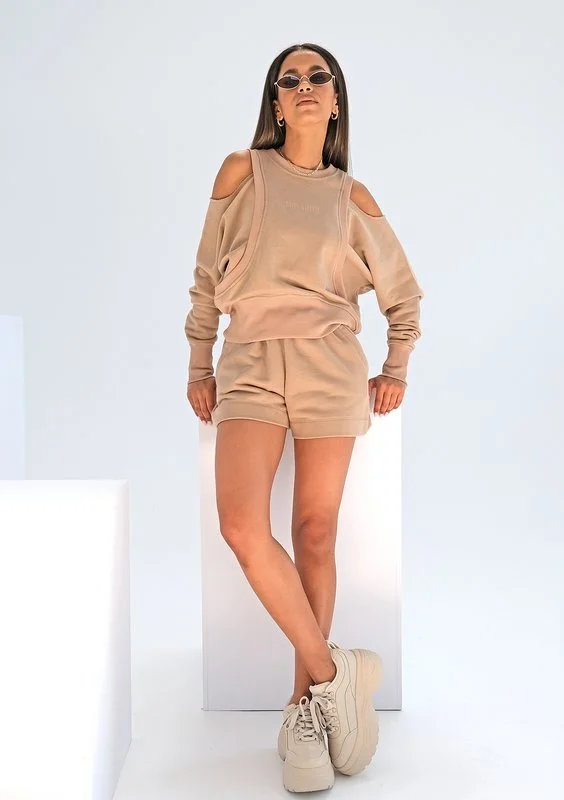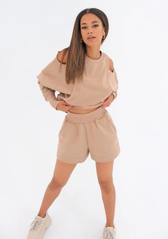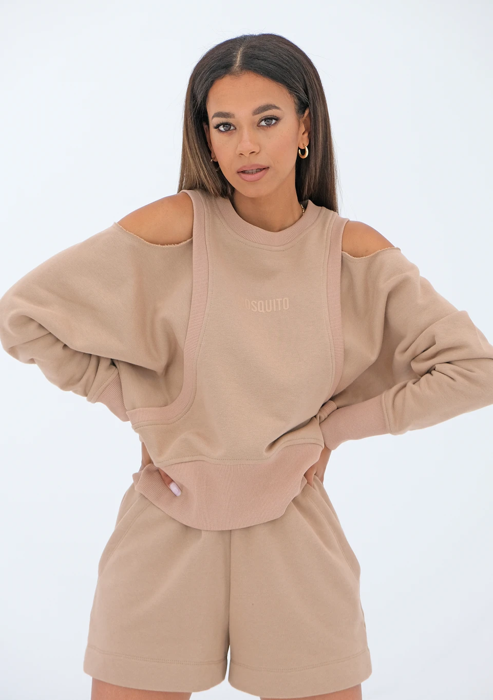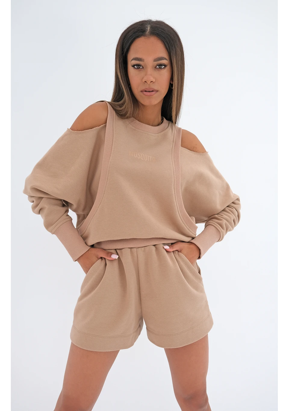 Przyjemnie miękka bluza w odcieniu kawy, która zaskakuje niepowtarzalnym fasonem. Wycięta na ramionach, świetnie wpisuje się w letni klimat. Ozdobiona logiem i ciekawym układem ściągaczy.