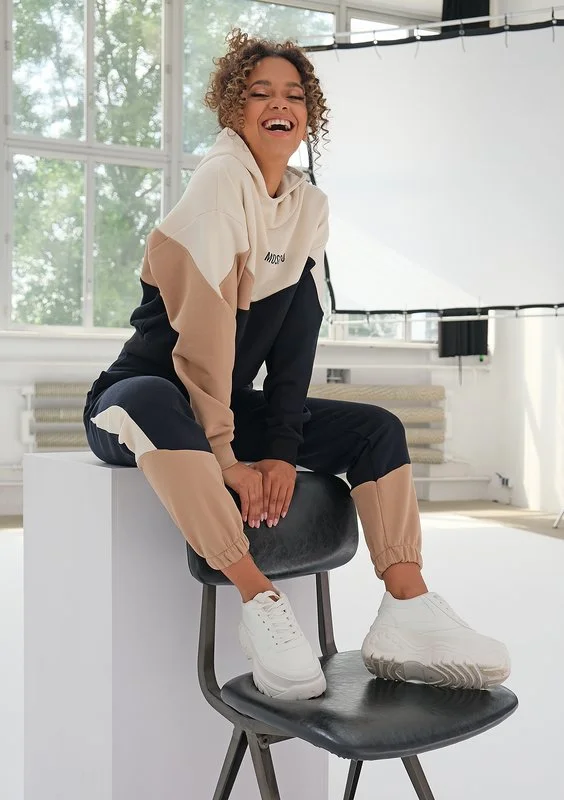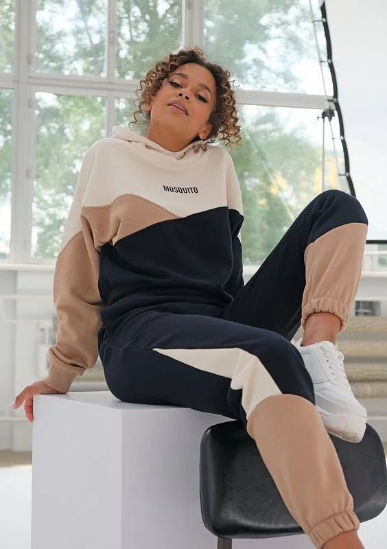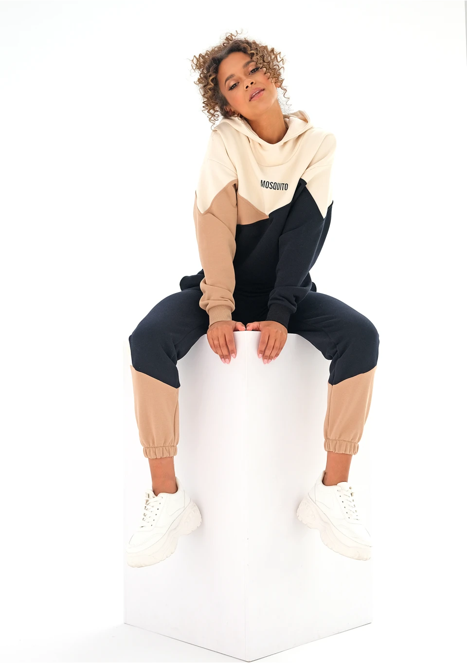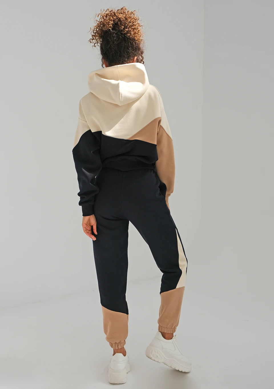 Przytulna bluza damska z kapturem o cudownym połączeniu naturalnych kolorów. Czerń geometrycznie zestawiona z beżem latte i odcieniem wanilii to stylowa propozycja na każdy sezon.