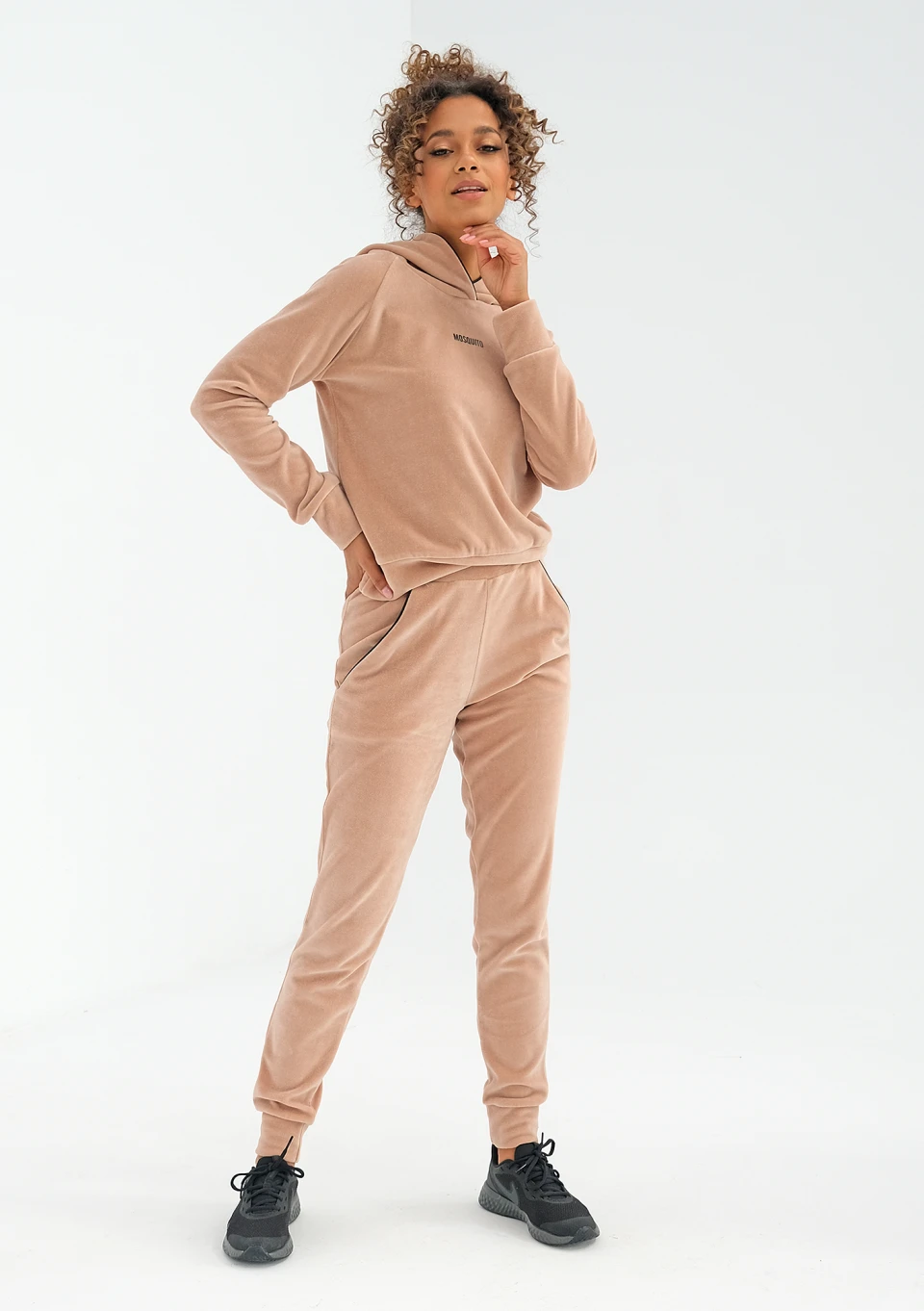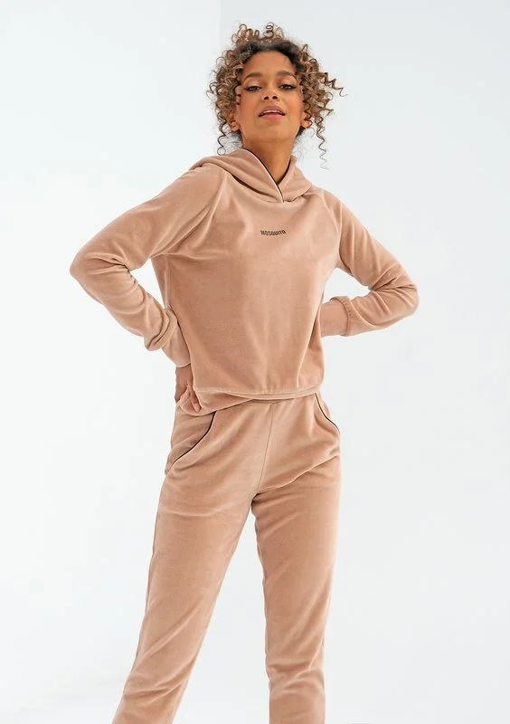 Beżowa bluza z kapturem w szykownym wydaniu. Zaskoczy Cię lśniącą, aksamitną fakturą, a także starannym wykończeniem każdego detalu.