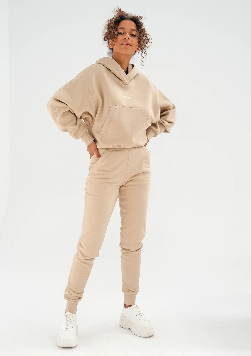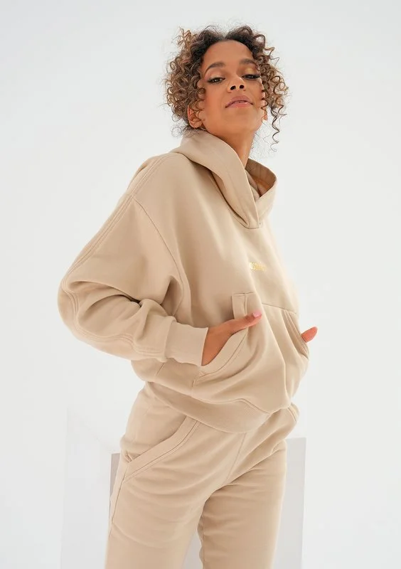 Ponadczasowa kangurka w delikatnym, piaskowym beżu. Ujmuje jasną estetyką i złotym logiem, które podkręca jej styl. Uszyta z przyjemnie miękkiej w dotyku dzianiny.