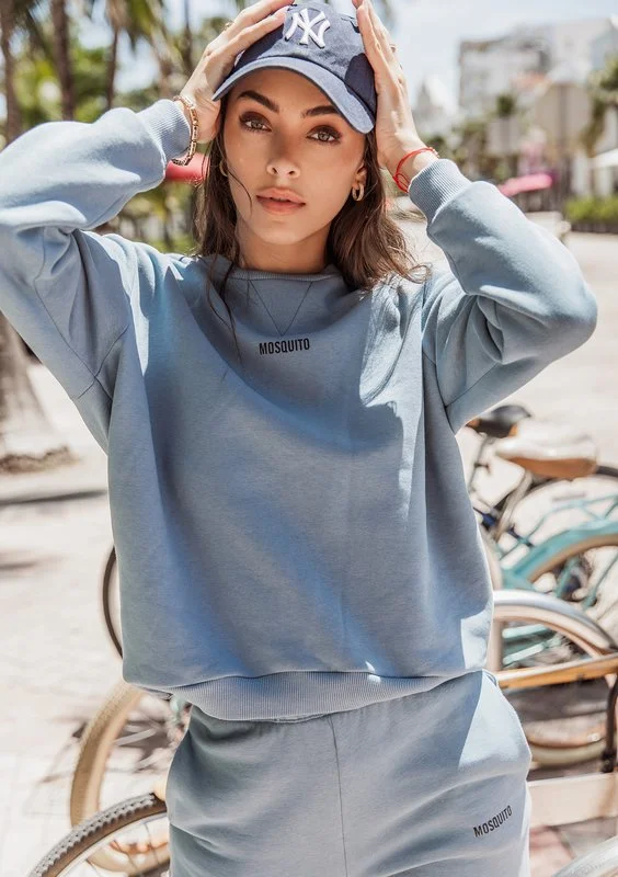 Błękitna bluza o lekkim, prostym fasonie. Zapewni Ci miękkie otulenie, dzięki mięsistej od spodu dzianinie. Ozdobiona stylowym, minimalistycznym logiem w czarnym kolorze.