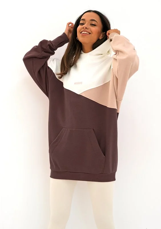 Wygodna, ciepła bluza dla miłośniczek krojów oversize. Wyróżnia się trójkolorowym zestawieniem beżu, ecru i ciemnego brązu. To długi fason z kapturem i kieszenią, idealny do sportowych stylizacji.