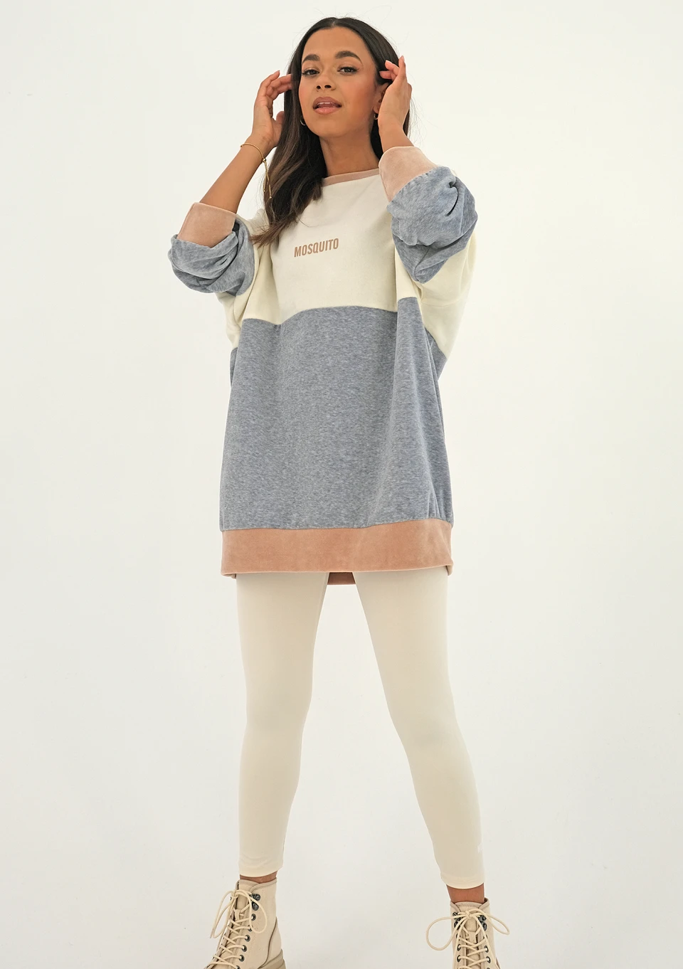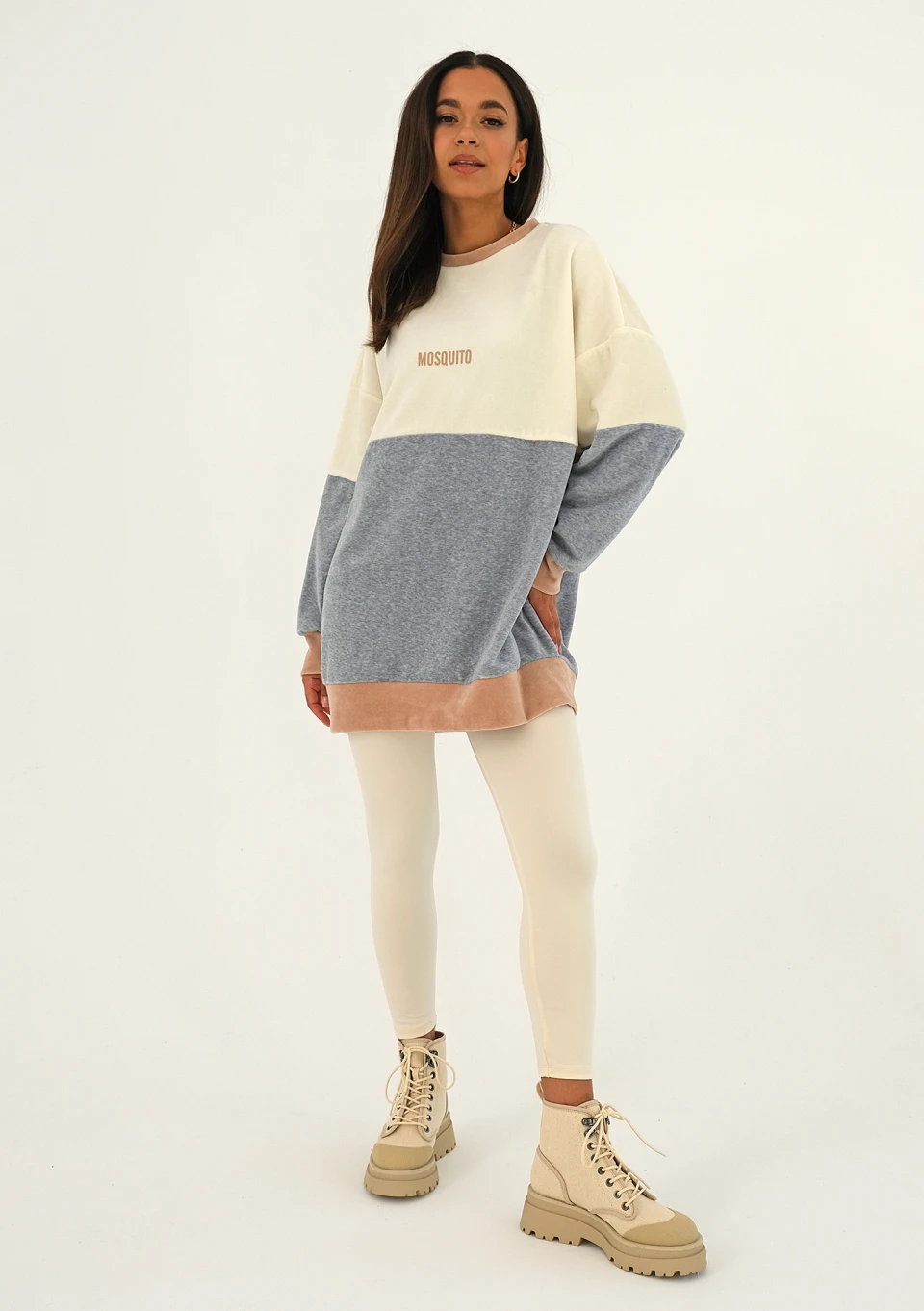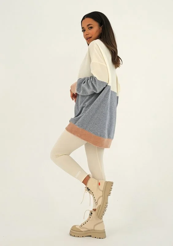 Kolorowa bluza z weluru, w naturalnych odcieniach beżu, wanilii i melanżowej szarości. Model bardzo wygodny, luźny i o długim kroju, idealny do sportowych stylizacji z legginsami.