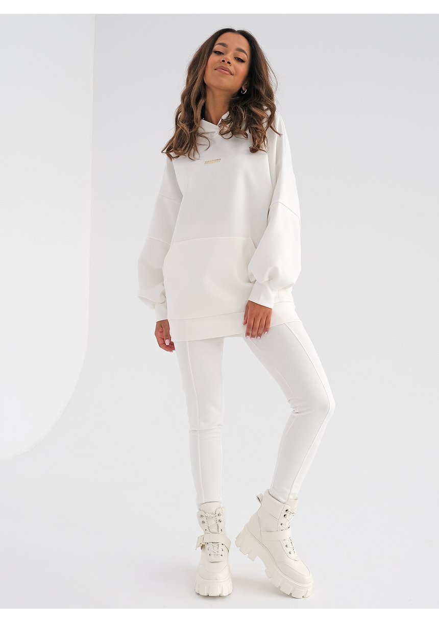 Długa bluza kangurka o luźnym kroju, w delikatnym odcieniu ecru. Fason z wygodnym kapturem i kieszenią, z eleganckiej imitacji zamszu. Bluza ozdobiona stylowym, złotym logiem.