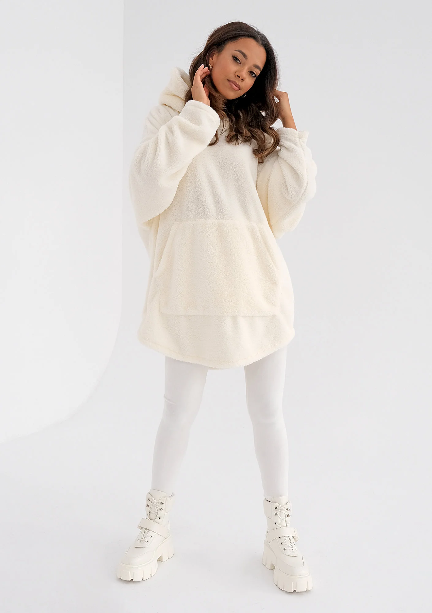 Bluza posiada duży kaptur i pojedynczą, kangurzą kieszeń. Wykonana jest z dzianiny w odcieniu écru, czyli kremowej bieli. Ubranie nie sprawi Ci trudności w pielęgnacji, możesz je prać w pralce w zwyczajny sposób. Jak wszystkie nasze produkty, bluza jest w 100% polskim produktem. Modelka Jackie ma na sobie białe legginsy ze sportowej kolekcji Move. Jeśli podoba Ci się jasna estetyka białej stylizacji, w nowej kolekcji pojawiły się również legginsy w odcieniu écru z imitacji zamszu i aksamitnej tkaniny velvet. Ubrania są dostępne w rozmiarach XS – L.
