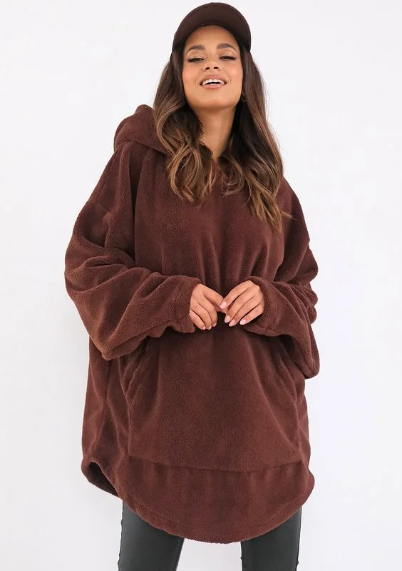 Ciepła, przyjemnie otulająca bluza futerkowa o długim i luźnym fasonie oversize. Wykonana w uniwersalnym odcieniu czekolady.