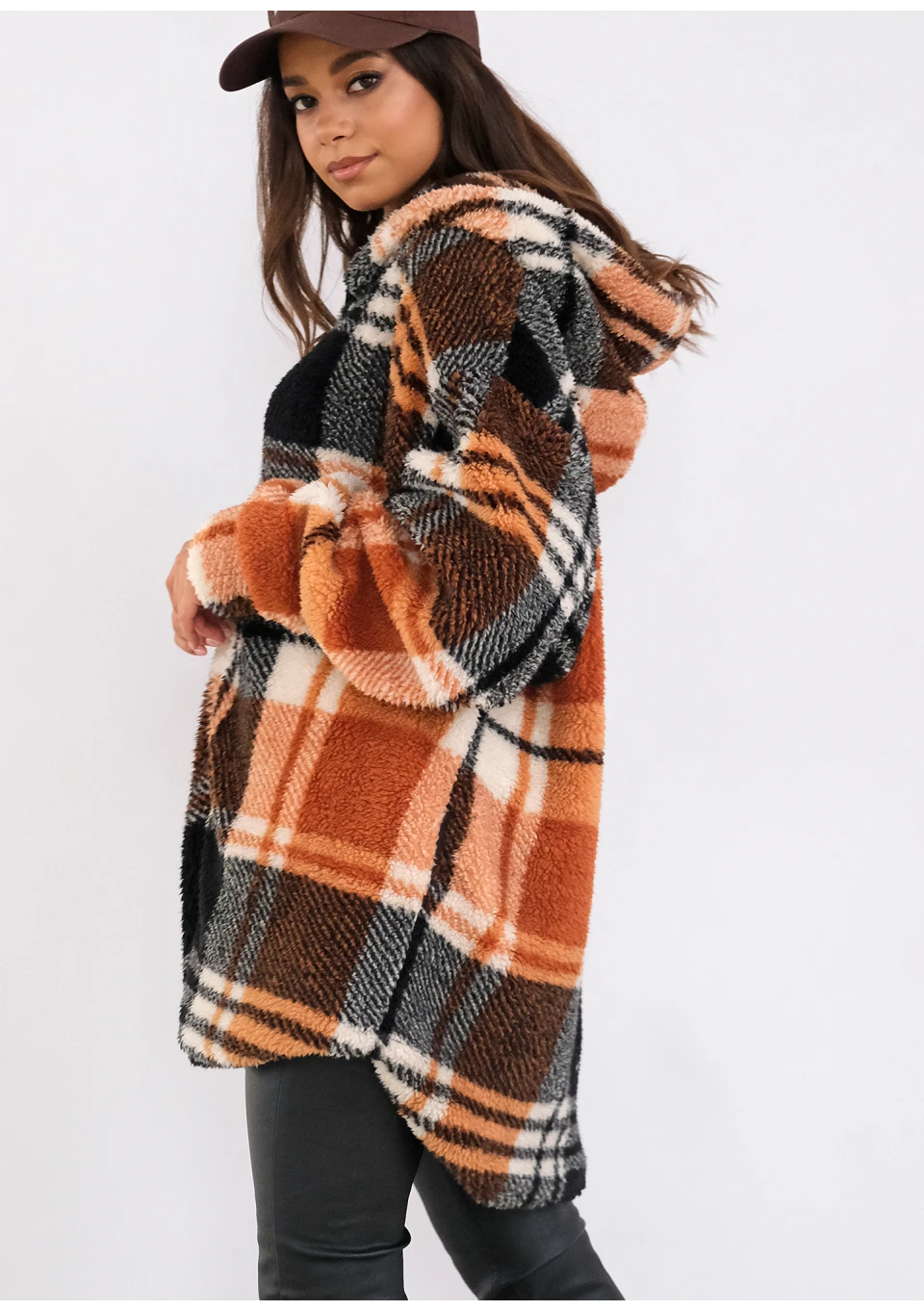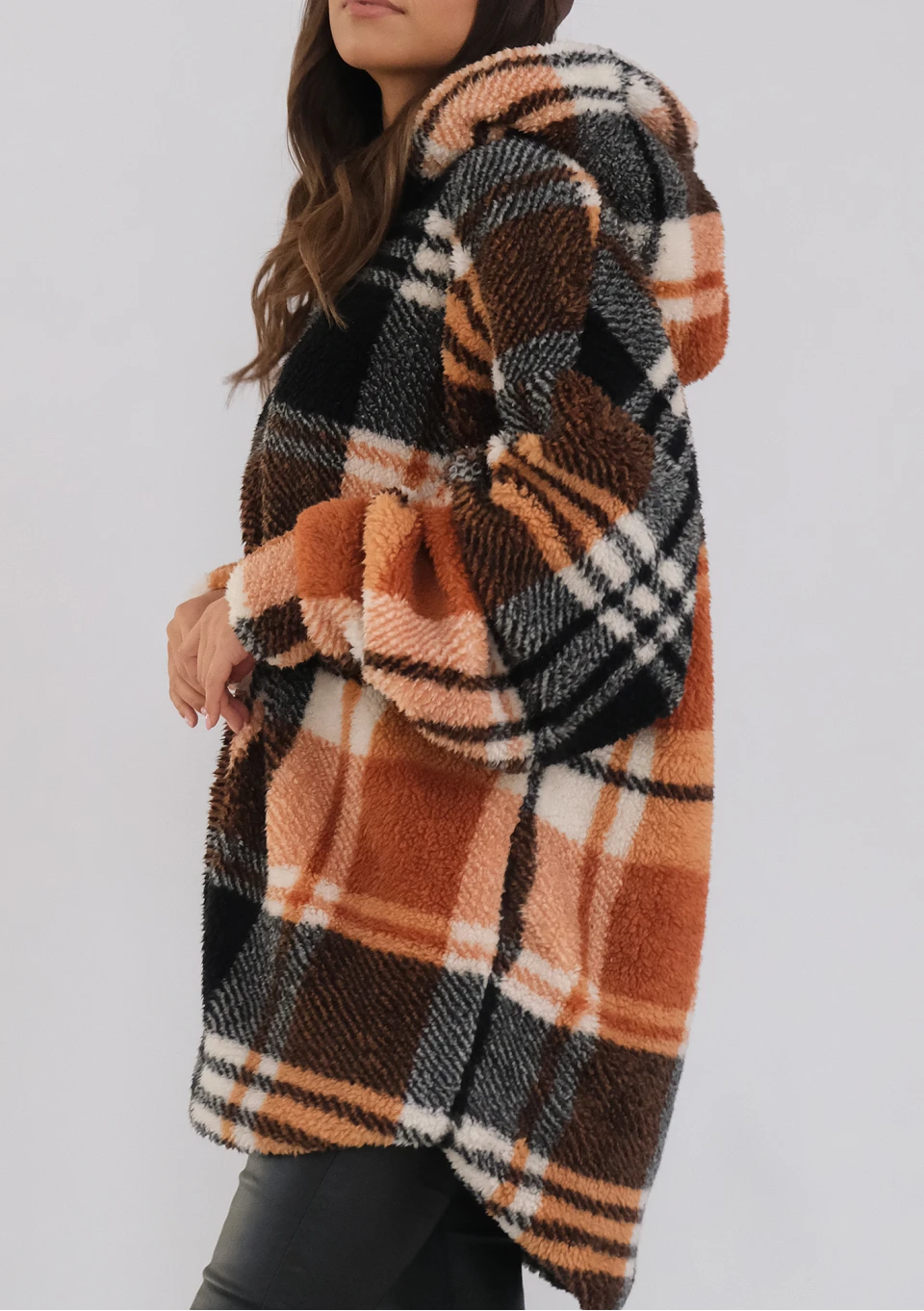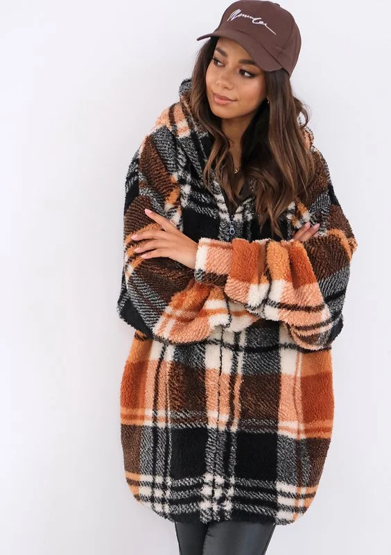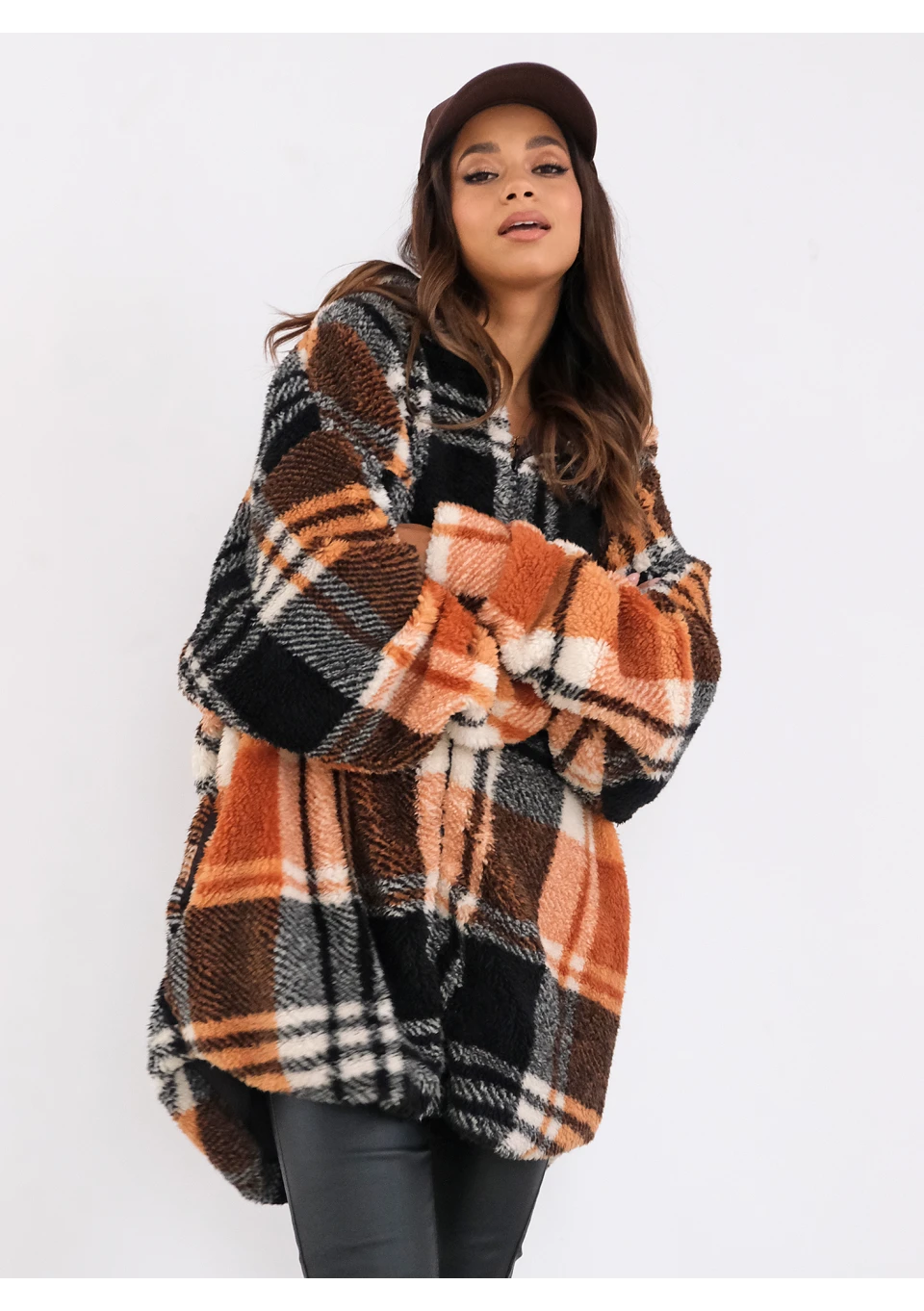 Przyjemnie ciepła bluza oversize z futerkowej dzianiny w kratę. Z wygodnym kapturem, dwoma kieszeniami i śliską podszewką.
