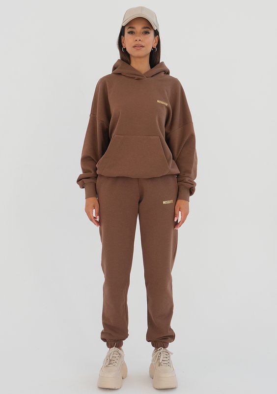 Czekoladowa bluza dresowa z kapturem i kieszenią to definicja ponadczasowego stylu i sportowej wygody. Szyta jest z dzianiny z meszkiem, ozdabiana złotym logiem. To model oversize.