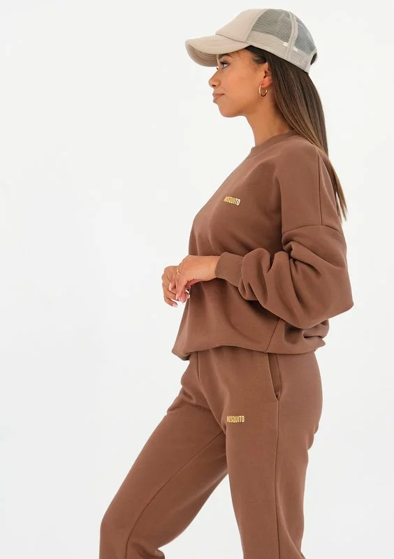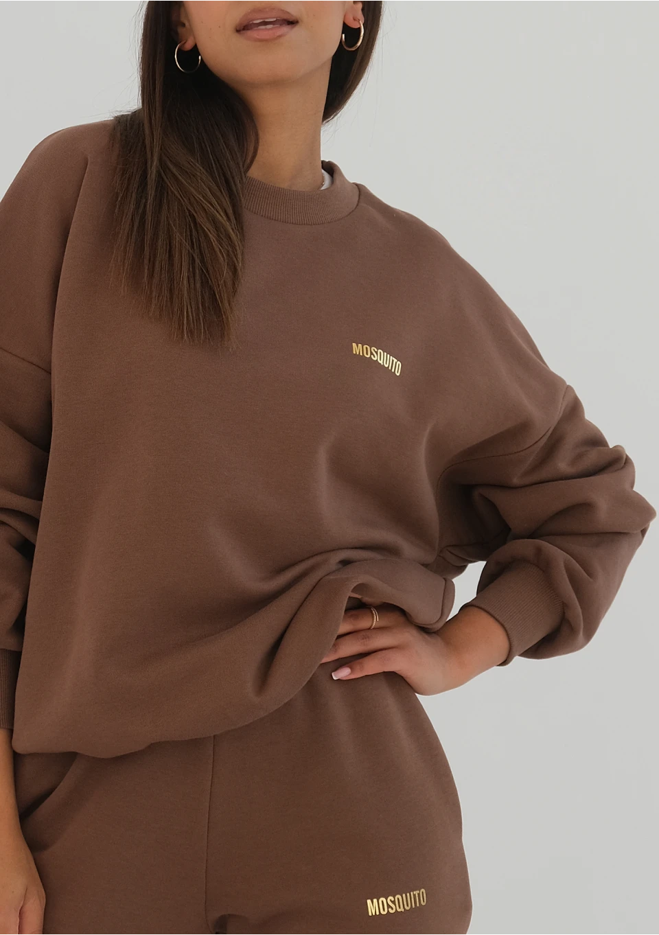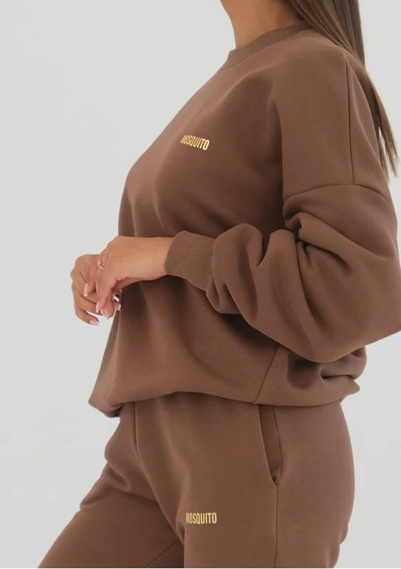 Czekoladowa bluza damska dla miłośniczek uniwersalnych i wygodnie luźnych fasonów. Minimalistycznie zdobiona złotym logiem, sprawdzi się w wielu połączeniach kolorystycznych.