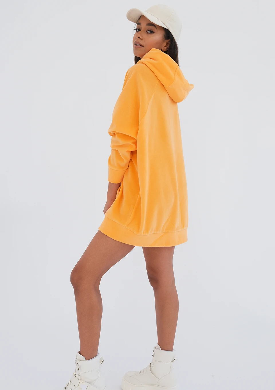 Pomarańczowa bluza z kapturem o miłej w dotyku fakturze. Model bardzo wygodny, luźny i o długim kroju, w energetyzującym odcieniu.