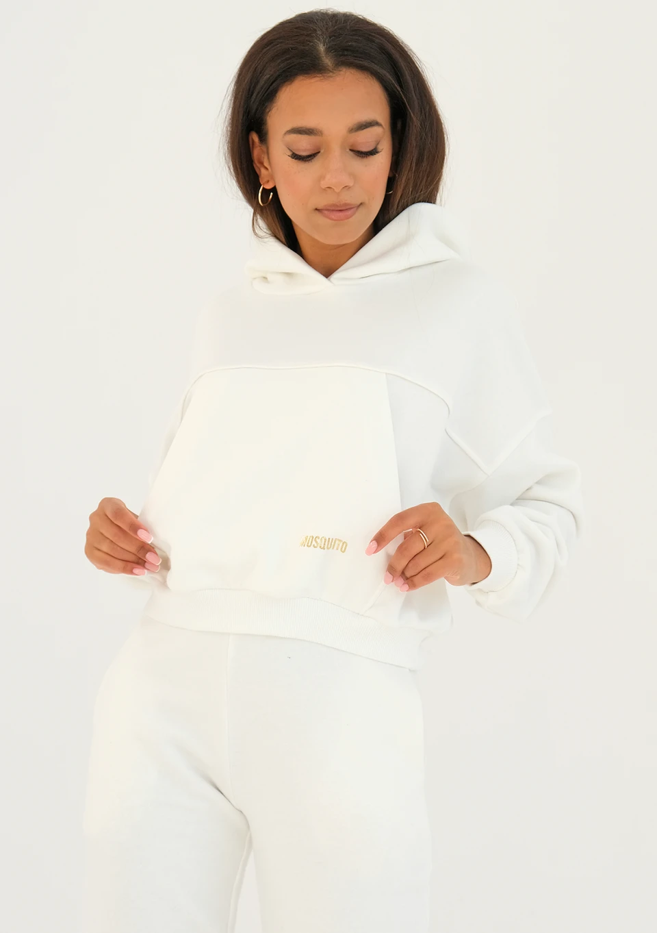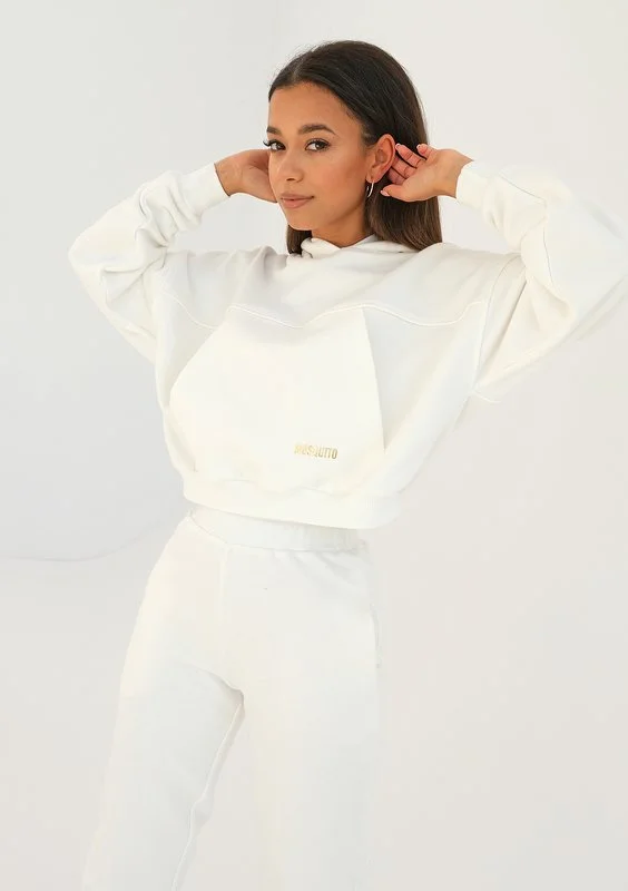 Kremowa bluza damska z kapturem dla zwolenniczek bardzo luźnych, jednocześnie krótkich fasonów. Estetycznie podkreślona złotym logiem, zachwyca praktycznym i wszechstronnym krojem.