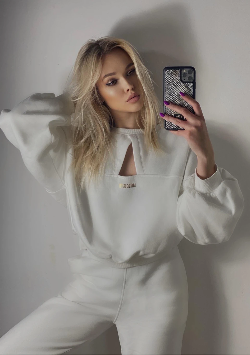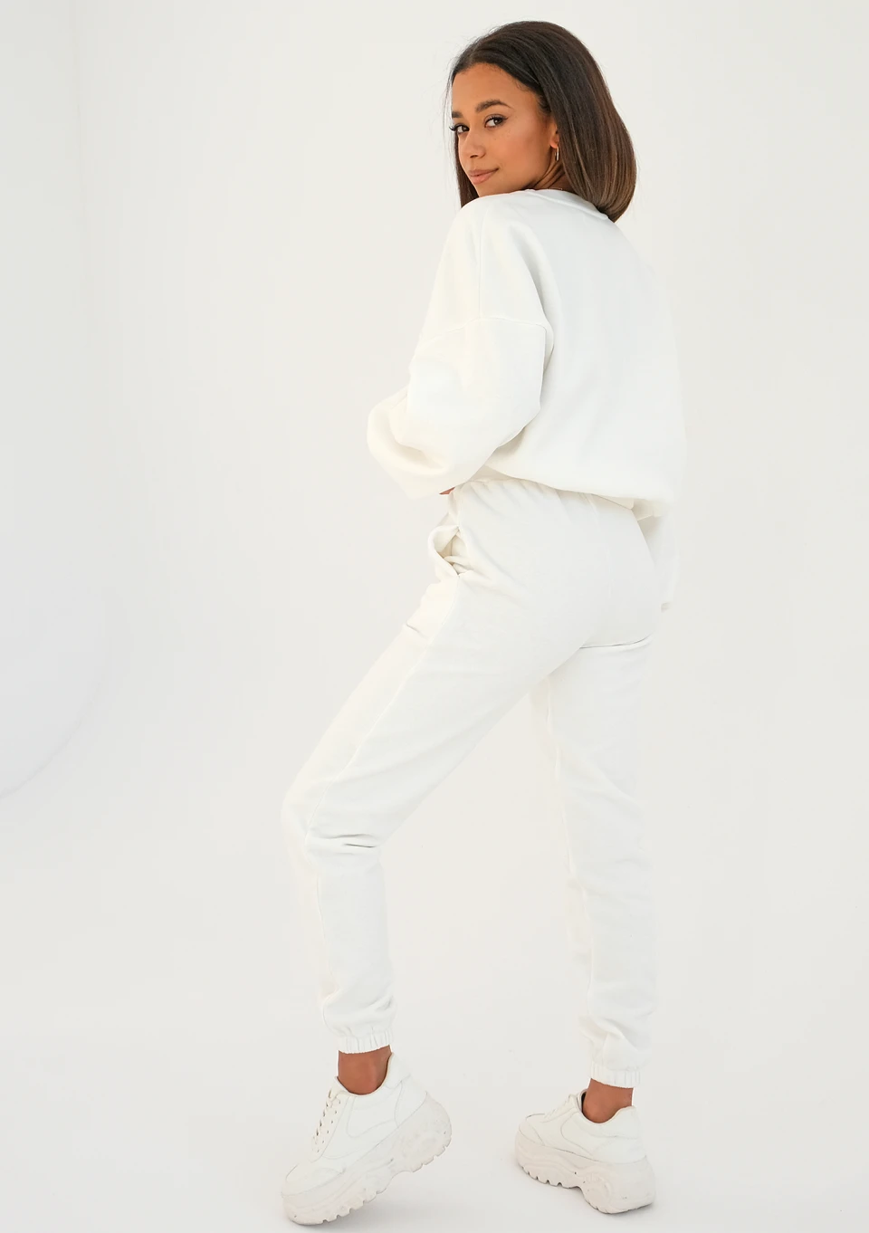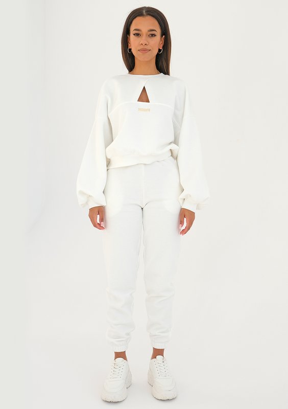 Kremowa bluza damska z niespotykanym, efektownym designem. Posiada krótki, bardzo luźny fason ozdobiony wycięciem i złotym logiem na dekolcie. Stworzy spójny komplet dresowy z kremowymi spodniami Loose.