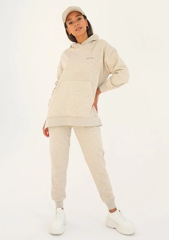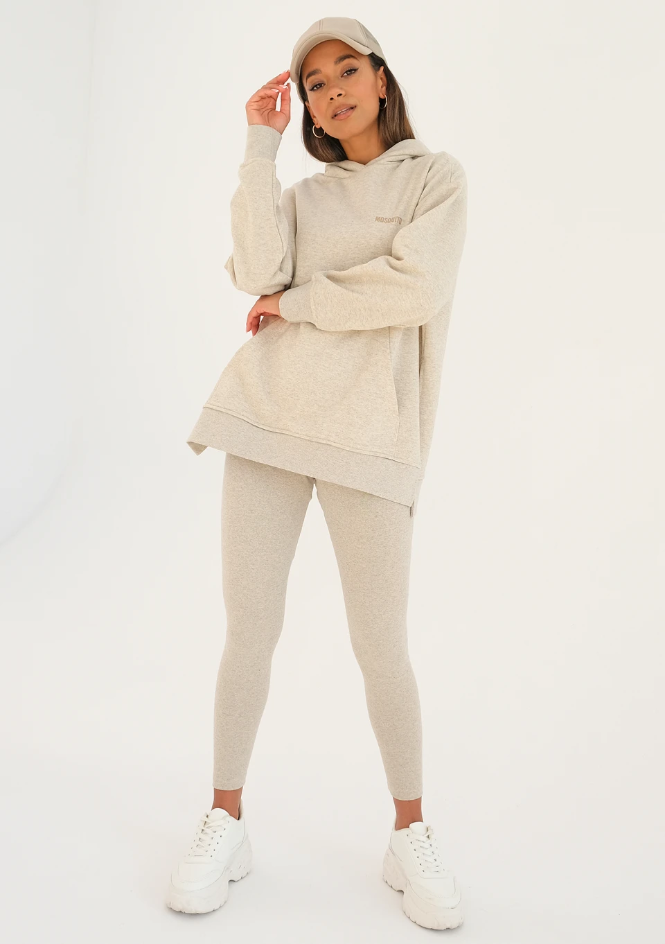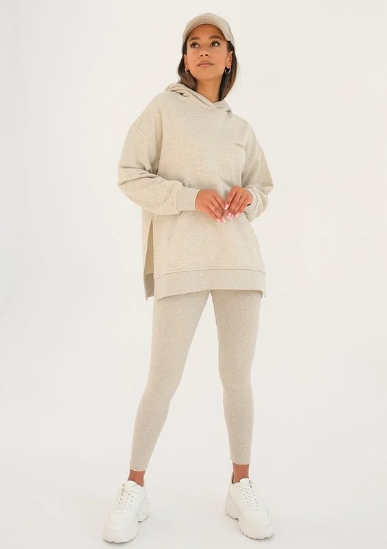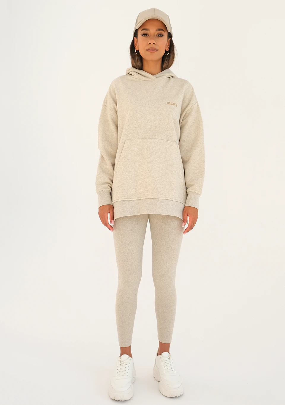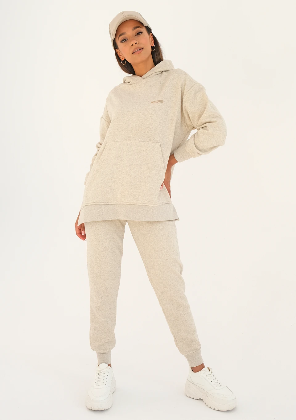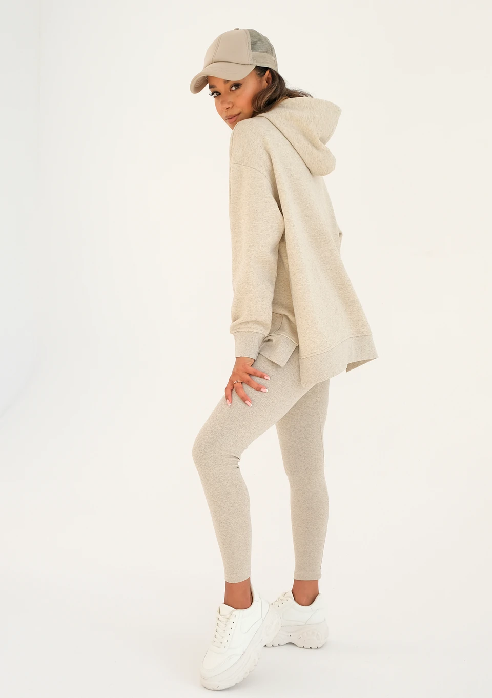 Beżowa bluza z kapturem i kieszenią w ponadczasowym stylu, o melanżowym deseniu. Szyjemy ją z lekkiej dzianiny bez puchowego spodu i ozdabiamy beżowym logiem. To model bardzo luźny, z wygodnymi wycięciami po bokach.