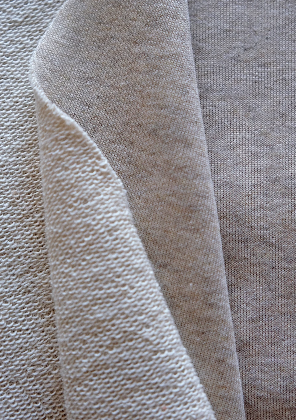 Skład 90% bawełna, 10% poliester. Jest to materiał o średniej gramaturze, z pętelkową fakturą od wewnątrz i wykończeniem zapewniającym dodatkową miękkość. Ostatnie zdjęcie ukazuje obie strony dzianiny.