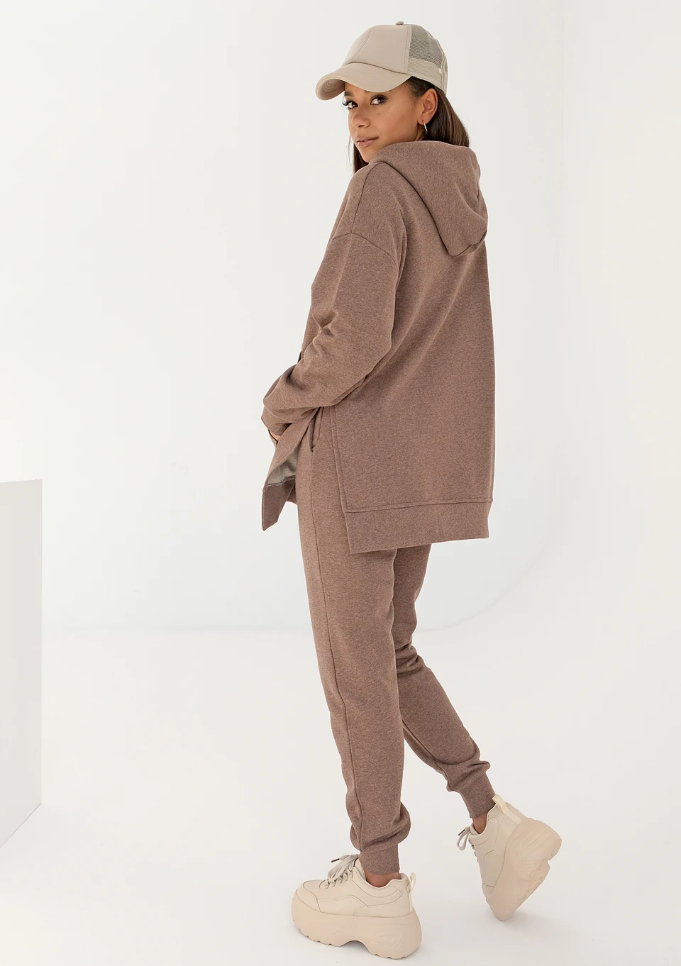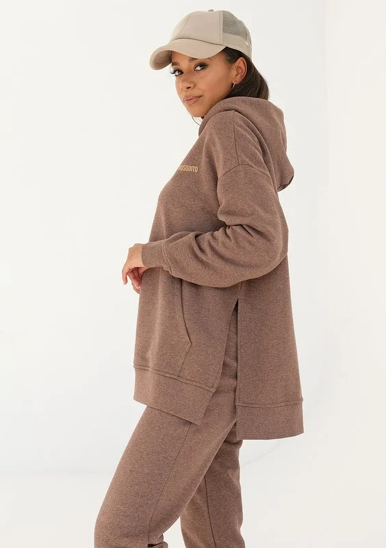 Melanżowa bluza damska kangurka z kapturem w spokojnym tonie kakao to wygodne okrycie basic, pasujące do wielu innych kolorów. To bluza z miękkiej dzianiny bez puchowego spodu, bardzo luźna i efektownie wycięta po bokach.