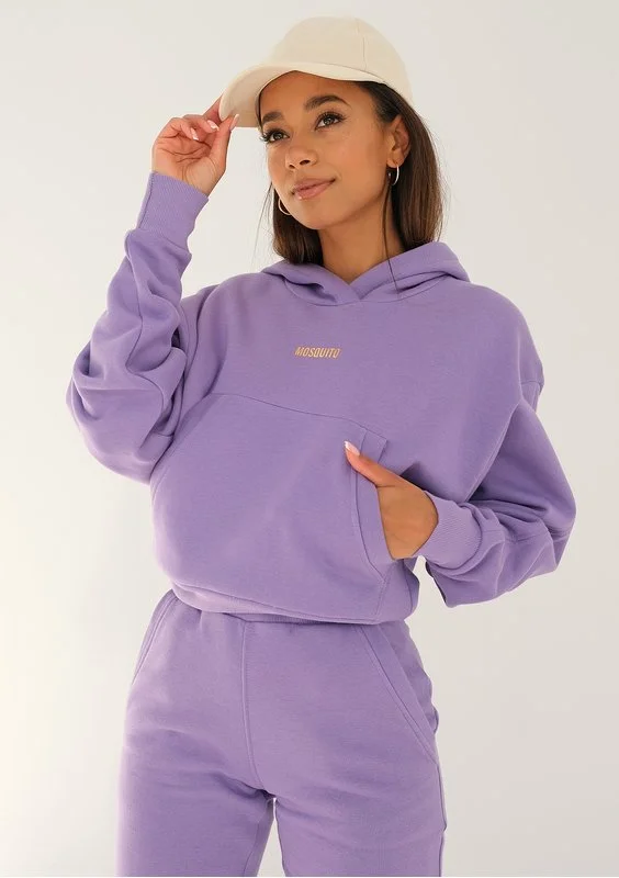 Fioletowa bluza kangurka o bestsellerowym, krótkim fasonie. Podkreśla talię, a praktyczny kaptur, kieszeń i elastyczne ściągacze zapewniają wygodne użytkowanie. W cudnym, fioletowym kolorze, ozdobiona drobnym, złotym logiem.
