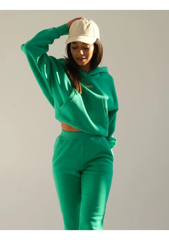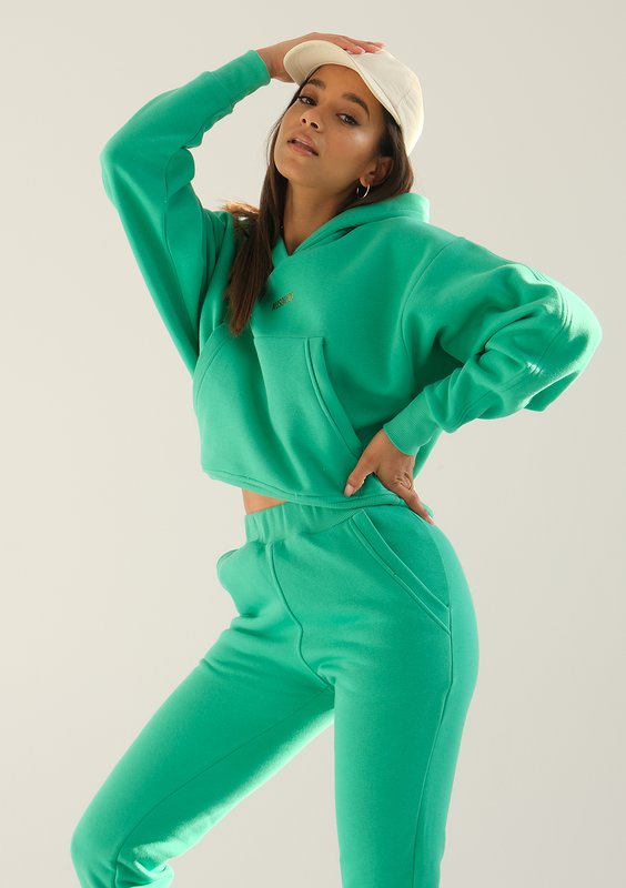 Wyjątkowa, damska bluza kangurka dla miłośniczek wyrazistych kolorów. Intensywną zieleń podkreśla złote logo. Bluza posiada krótki, sięgający pasa krój, dzięki któremu podkreślisz sylwetkę.
