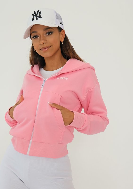 Różowa bluza damska z kapturem, wygodnie zapinana suwakiem. Model na cieplejsze pory roku, wykonany z lekkiej dzianiny bawełnianej. Bluza posiada krótki, świetnie podkreślający sylwetkę fason z kieszeniami i elastycznymi ściągaczami. Stylowo sygnowana białym logiem.
