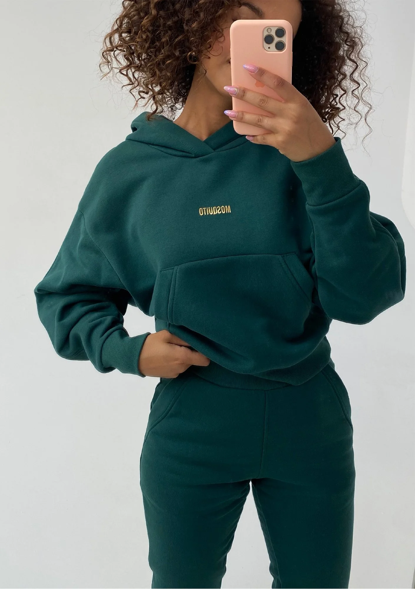 Krótka bluza damska, w kolorze zielonym. Posiada wszyty kaptur, pojemną kieszeń na przodzie - typu kangur. Bluza, dzięki swojemu niezwykle wygodnemu krojowi i charakterystycznej formie świetnie dopasuje się do każdego typu kobiecej sylwetki oraz będzie się ją komfortowo nosić. Fason ten posiada wszytą ozdobną aplikację z przodu, nad kieszenią. Produkt idealnie sprawdzi się w sezonie jesienno-zimowym, ale również wiosennym.