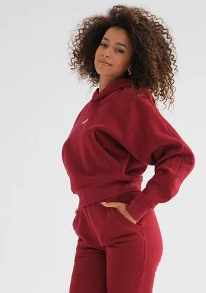 Do damskiej bluzy dresowej można dopasować wiele kreacji. Będzie pasowała do czerwonych spodni dresowych przedstawionych na zdjęciu u modelki, ale także do zwykłych jeansów. Zastosowanie odnajdzie również pod modny bezrękawnik, także do spódniczek. Bluza pasuje na wyjścia na luźn randkę, spacery do parku. Złoty logotyp idealnie komponuje się z czerwonym kolorem bluzy. Kangurkowa kieszeń może służyć do schowania większych rzeczy takich jak telefon, klucze przydatnych podczas wyjść. Bluza posiada kaptur, dzięki któremu można ogrzać się w chłodniejszy wieczór, nie tracąc przy tym seksownego i modnego wyglądu. Materiał posiada certyfikat Oeko Tex Standard 100 oznaczający, że nie zawiera szkodliwych substancji oraz toksycznych barwników.
